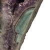 This is a large Amethyst geode. It is two pieces of a single Amethyst geode that were cut in half. The black metal stand was custom-made for this specific specimen. When cut, this geode shape is of a butterfly! it is gorgeous. The back side of the Amethyst cluster of crystals is concreted to stabilize the formation and painted a flat black color. All around the edges of the front side have been polished and have some blue Agate throughout. Then inside the geodes display hundreds of Amethyst crystal points.