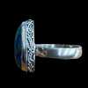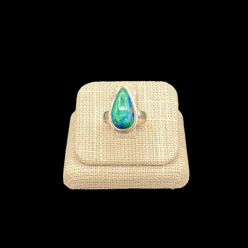 This stunning pear-shaped cabochon-cut Malachite with Azurite sterling silver ring features a Bali-design bezel setting. Malachite is a copper carbonate mineral with a hardness of 3.5 to 4 (a diamond is a 10). Deposits of malachite are found in Zaire, Australia, Chile, South Africa, and the United States.