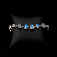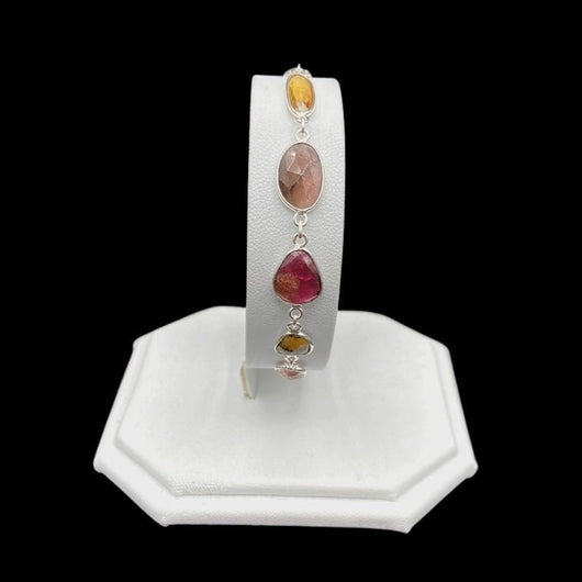 Tourmaline naturally occurs in many different colors. This beautiful bracelet features a variety of colors, and each cabochon Tourmaline is bezel set in sterling silver and the links are also sterling silver. 925 sterling silver is an excellent way to set stones. The lobster claw clasp is also sterling silver. Though the bracelet is 8 inches in length, it can be shortened by a jeweler or can be clasped at a link that will shorten the length.