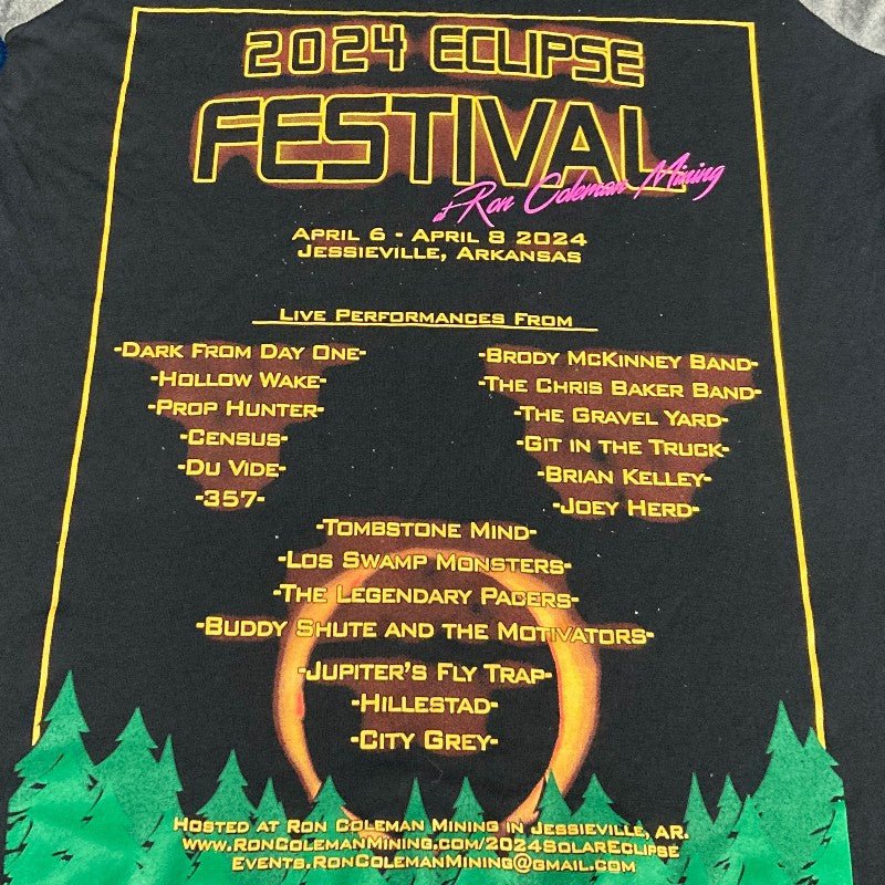Buy a commemorative Eclipse Music Festival baseball-style black shirt with gray sleeves. The front of the shirt has glow-in-the-dark 2024 Eclipse Festival gold graphics and purple Ron Coleman Mining. The back of the shirt displays our band lineup.