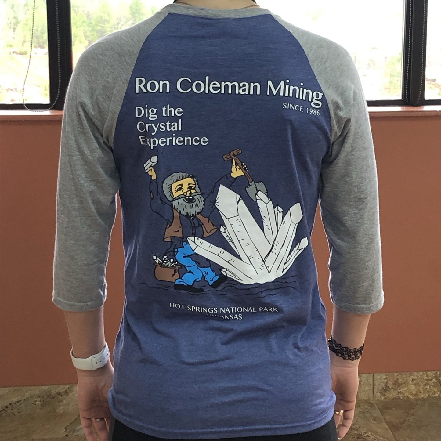 Beautiful soft tri-blend unisex adult t-shirt in blue jeans color with heather gray 3/4-length sleeves and the "Dig the crystal experience" front print.  Ron Coleman Mining Since 1986 "Dig the Crystal Experience, a large white quartz crystal cluster outlined in black, Hot Springs National Park, Arkansas, and our mascot miner holding tools.  It's a thoughtful gift for someone who has visited our quartz mine, or buy it for yourself!