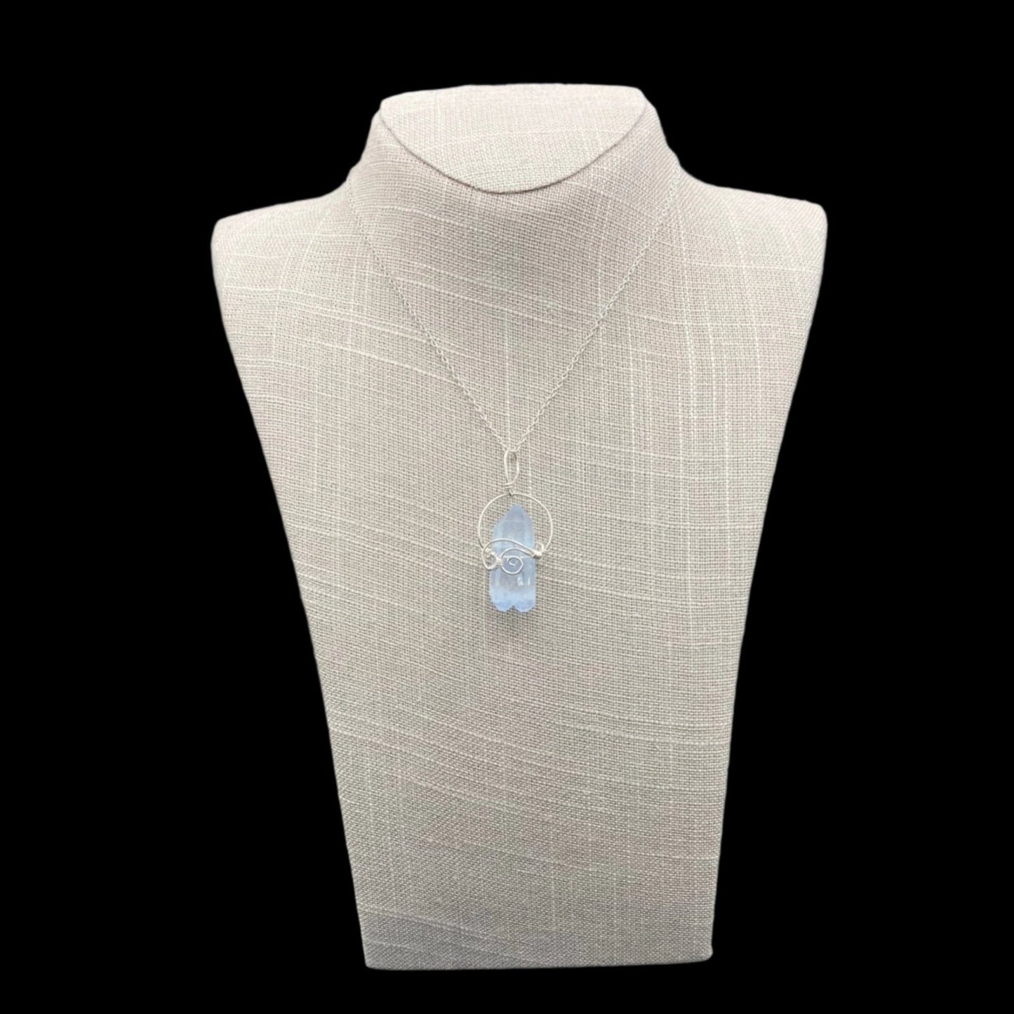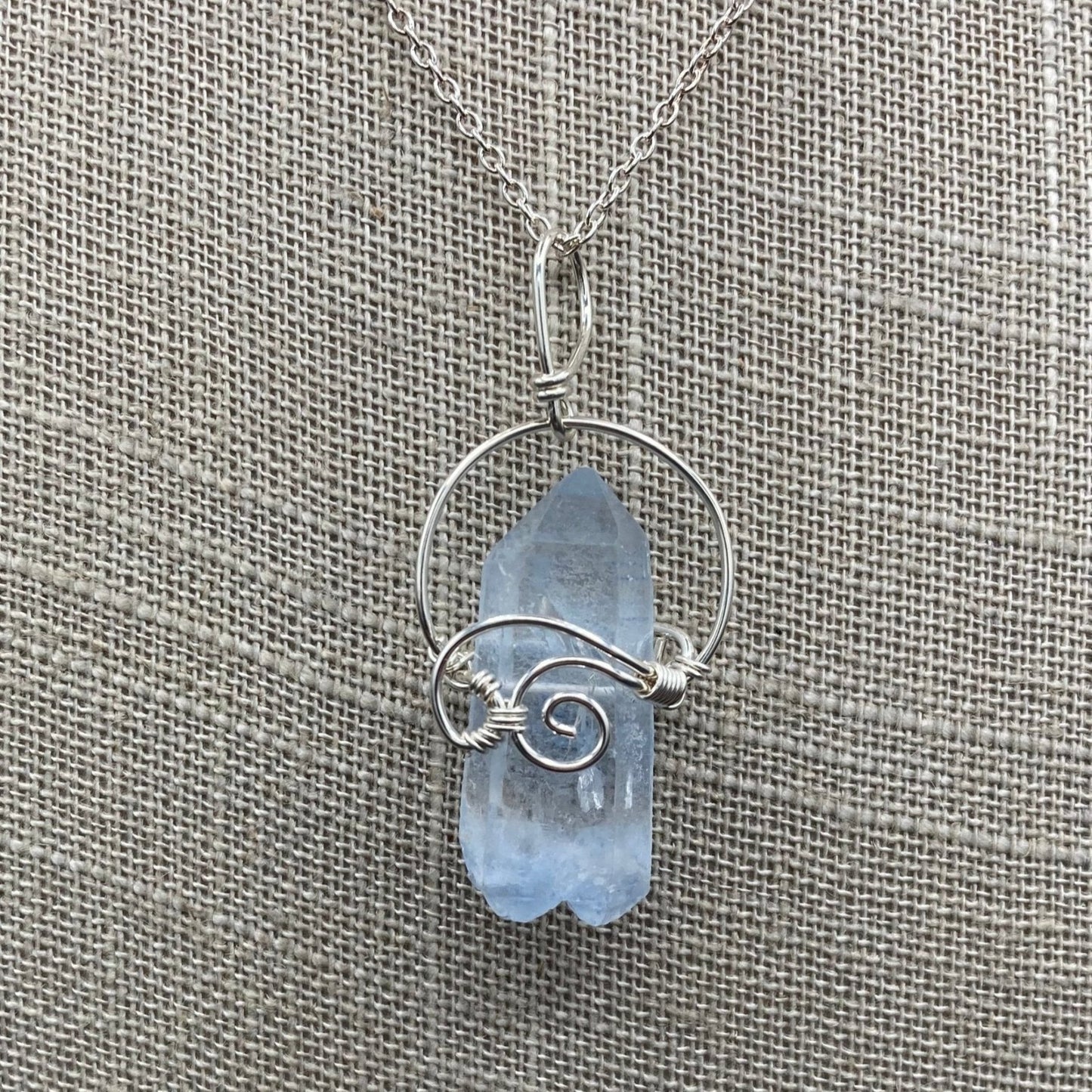 Enjoy wearing this one-of-a-kind adjustable Sterling Silver and hand wire-wrapped Dumortierite Quartz necklace. The Dumortierite crystal point is from Brazil. The intricate Sterling Silver wire wrapped around the Quartz point was made by Scott Mcneely in the U.S.A. This versatile Sterling Silver chain is adjustable and has a sturdy lobster claw clasp.