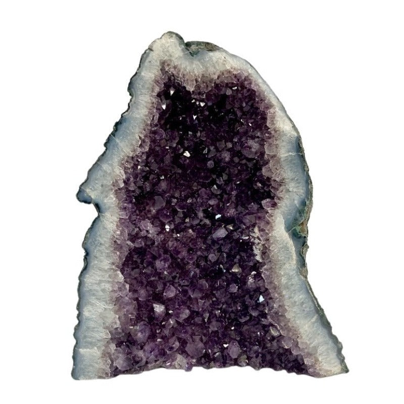 The face of this cathedral has been smoothly polished to a high shine. In the very center is big Purple Amethyst quartz points and surrounding them is a ring of Agate. The Agate is blue, gray, and some green. The outside of this cathedral is painted a flat black, so it will go with any decor.