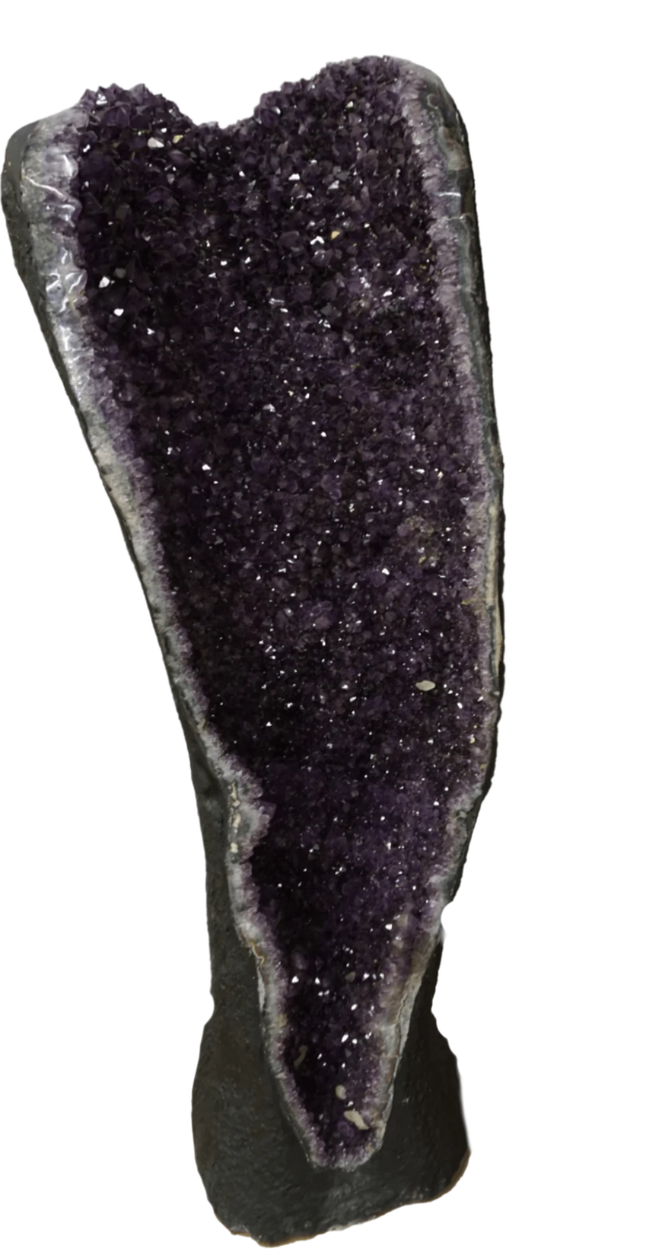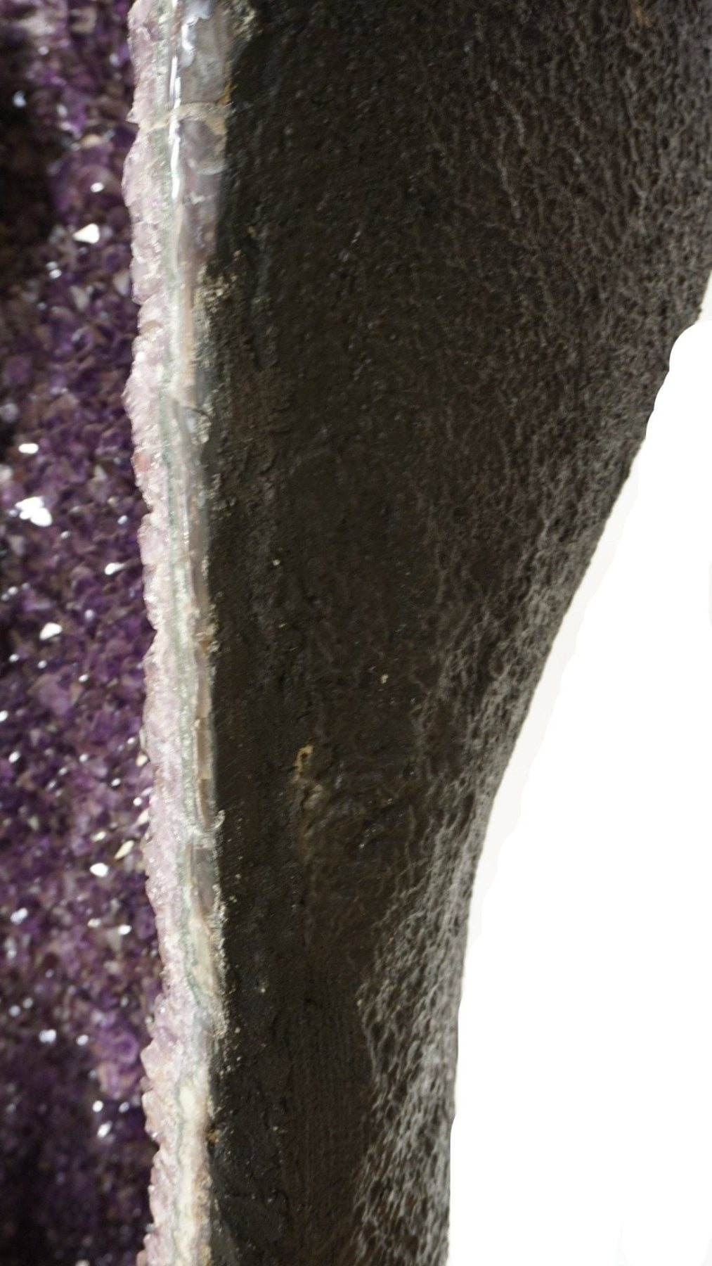 Enjoy viewing the beautiful, sparkling crystals within this gorgeous, tall Amethyst geode cave in your home or office space. Amethyst geode caves are all one of a kind, created by nature, and will enthrall you with their magnificent sparkle and fascinating crystal formations. Purple luxury home accents are trending. The significant amethyst points scintillate in light, bringing a sense of luxury to your home or office. This breathtakingly large specimen has a flat bottom and is ready to decorate your space. This will be a conversation starter if you're seeking a luxury interior design focal point.