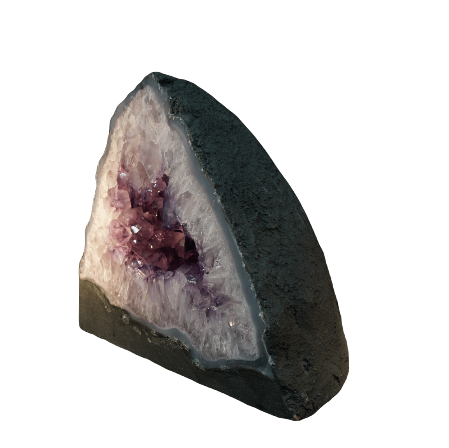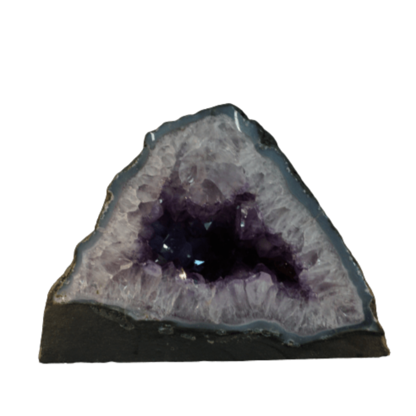 This is a beautiful small specimen with deep purple Amethyst that contrasts nicely with pure white crystals and blue agate polished edges. Amethyst inspires a peaceful vibration within any space, particularly the bedroom and meditation room.
