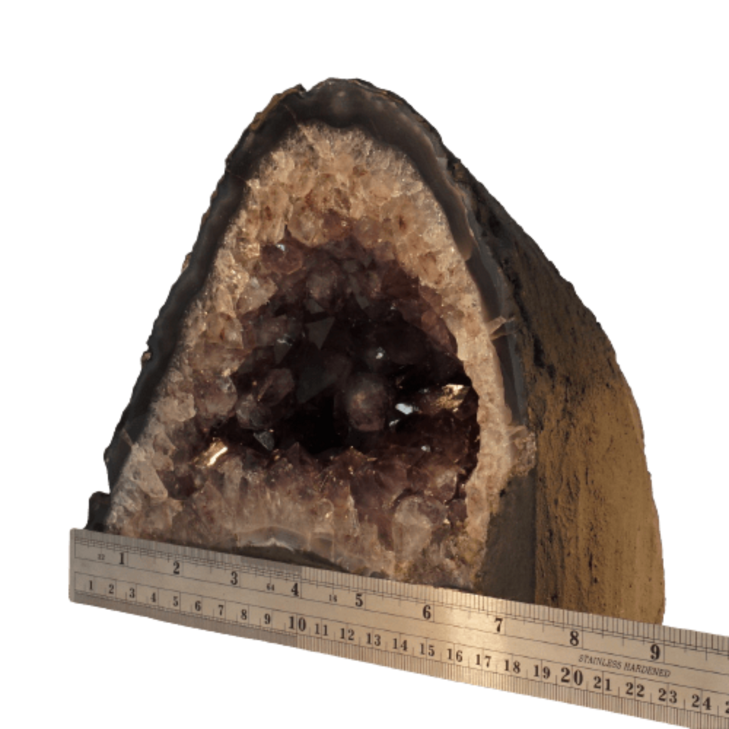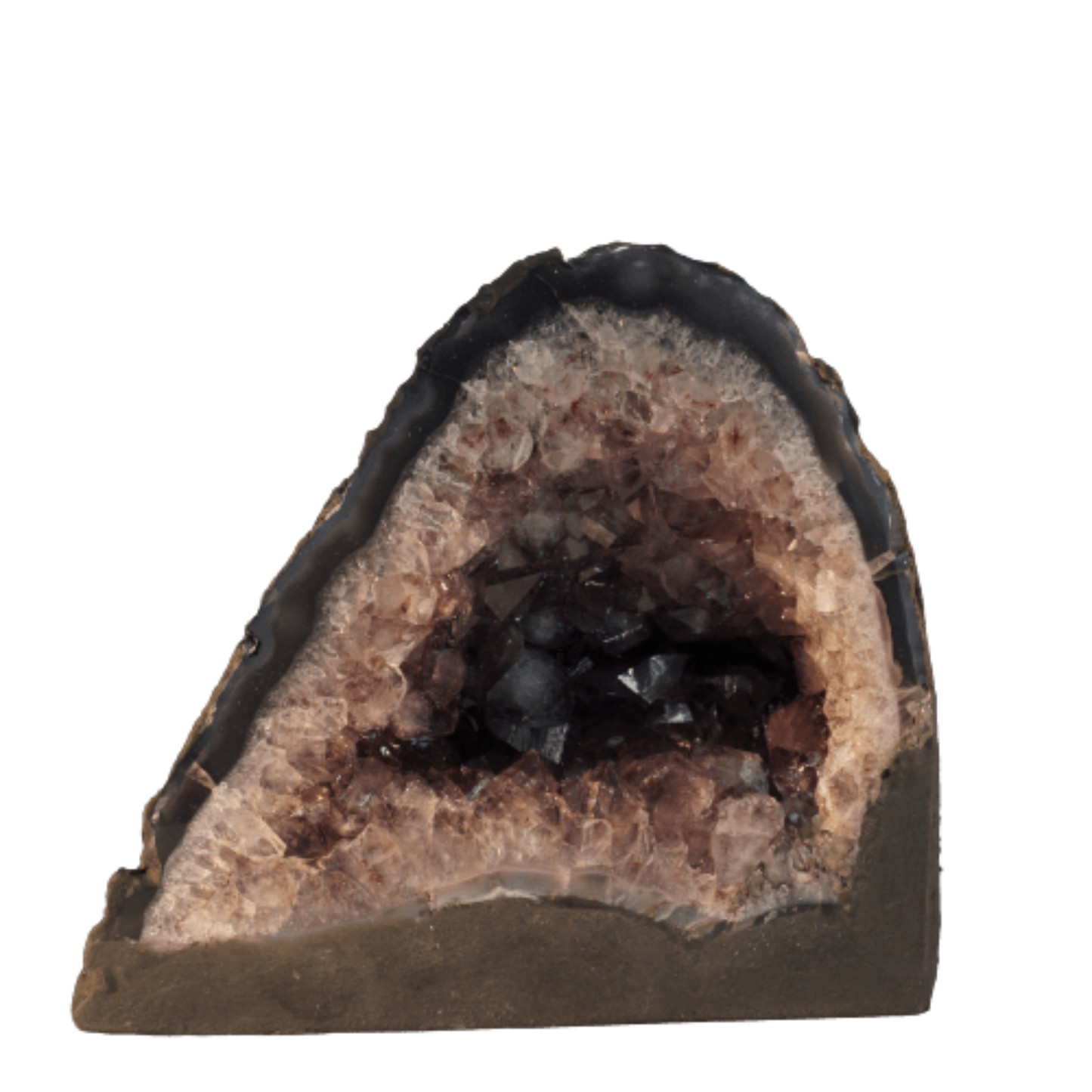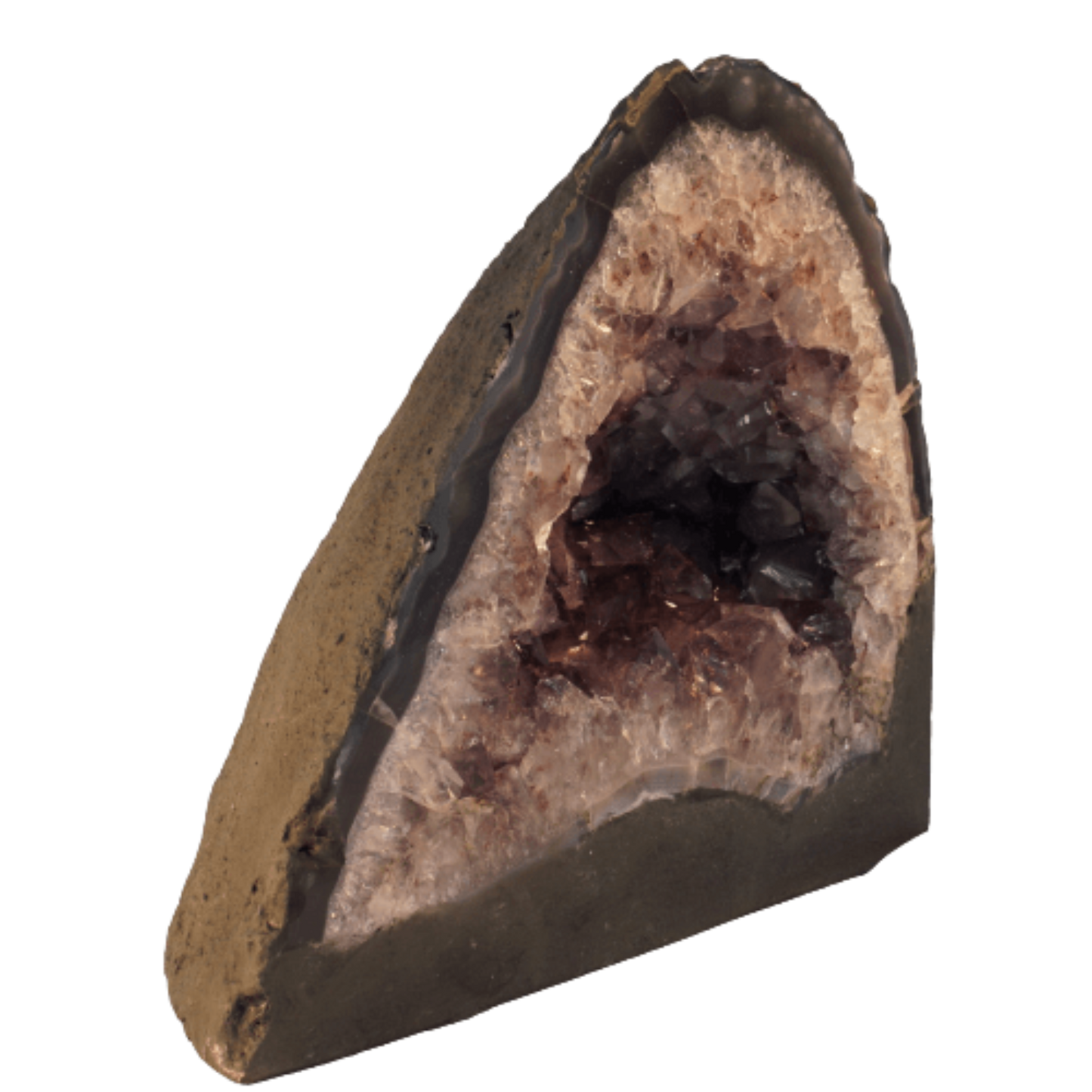 This beautiful tabletop size Amethyst geode half is budget-friendly. This specimen features beautiful deep purple crystal clusters and lovely polished amethyst sides. It will look fabulous on your shelf, side table, bathroom counter, or fireplace mantle.
