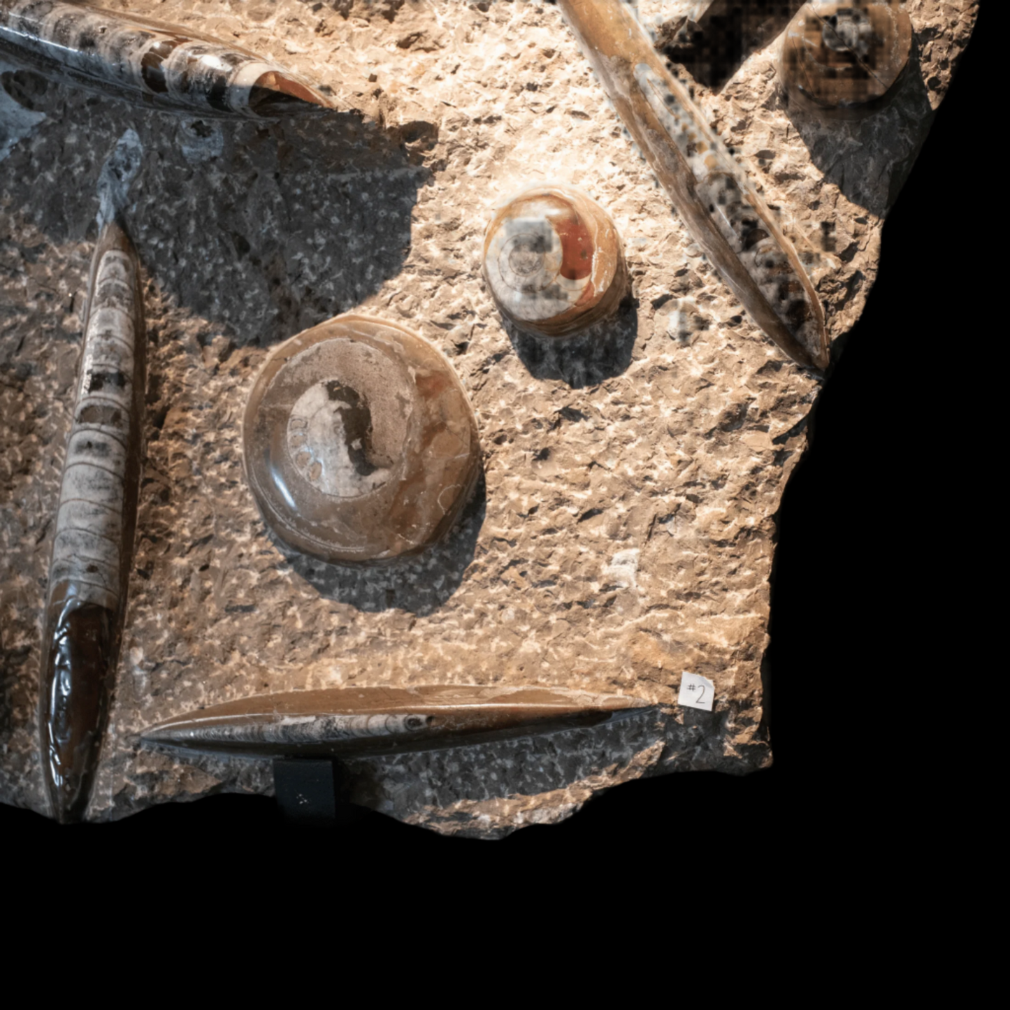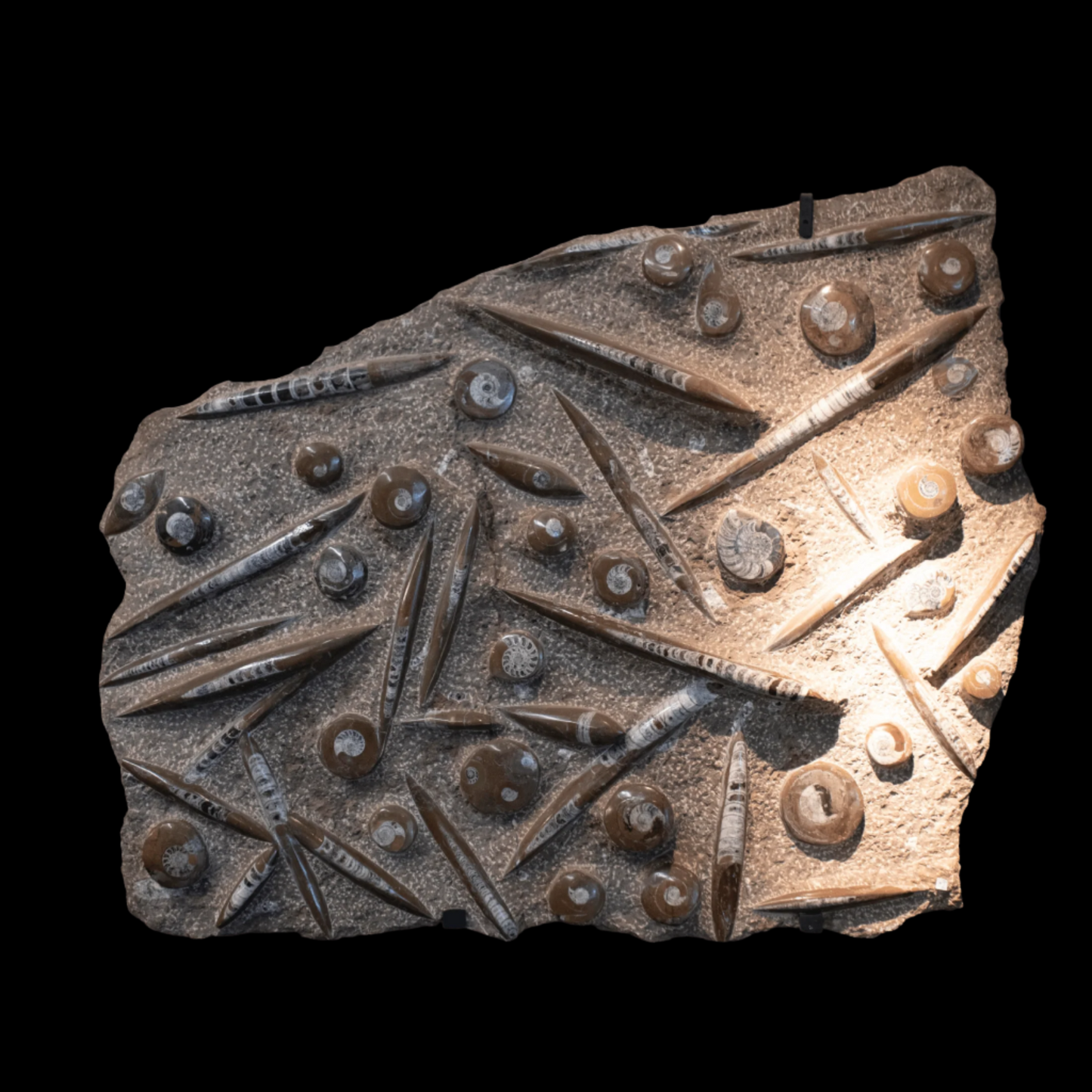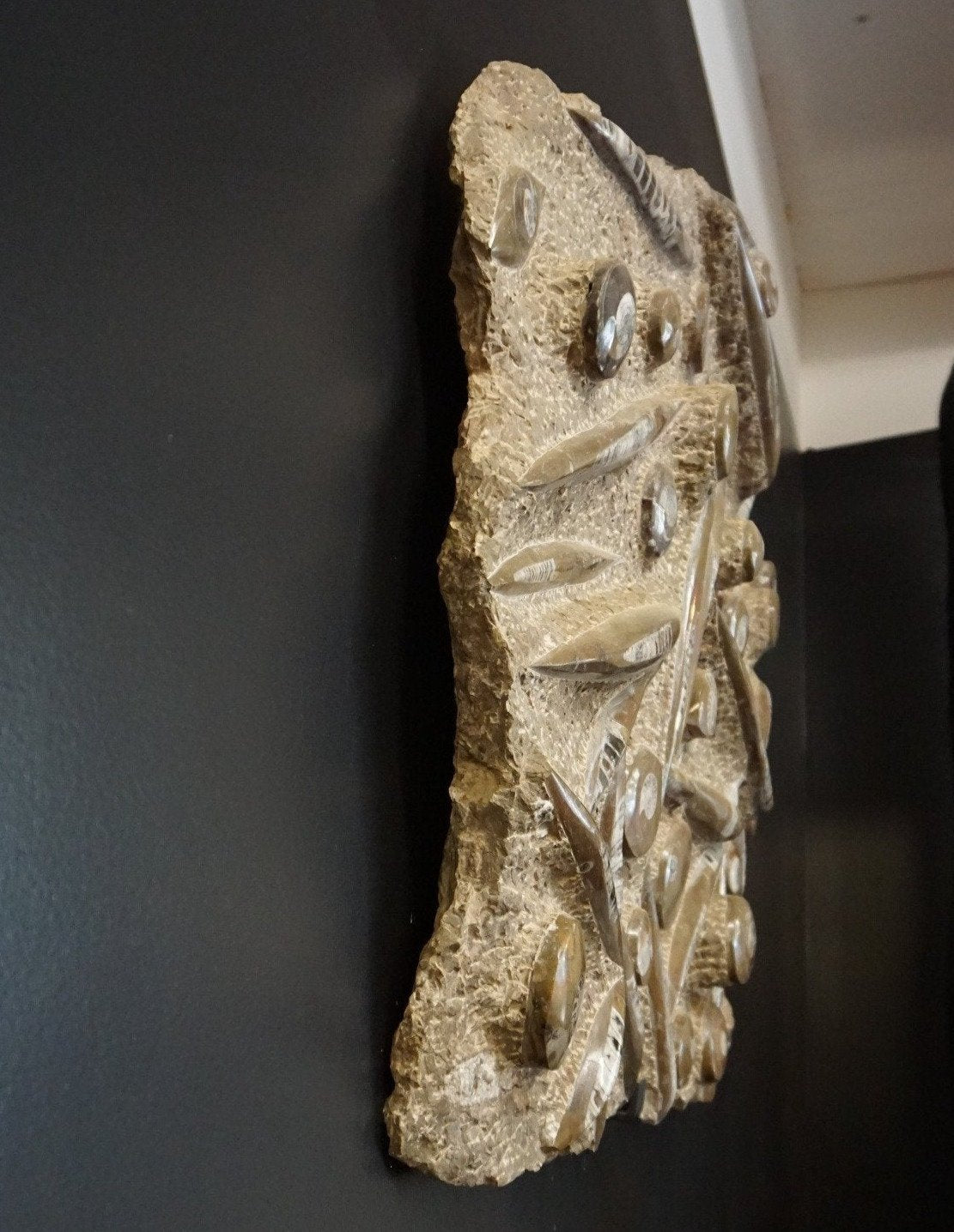 This genuine fossil plate comprises genuine Ammonites and Orthoceras (Orthoceratites). The wall-hanging hardware is included in your purchase. What a colossally fabulous gift for a mineral collector! The custom-made black metal wall mount/frame is included in the price. Natural color tones in this rare fossil specimen are sand, tan, brown, gray, black, brick, red, and white. The asymmetrical shape of this stone makes for a unique focal point. This interior design accessory will place prominence on the wall of your library, over the fireplace mantle, or in any room. It is a thoughtful gift for an archaeology buff, rockhound, or artifact collector.