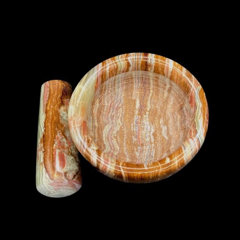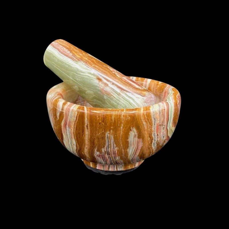 This beautiful Banded Green Onyx Mortar and Pestle is both functional and decorative. Hand-carved and polished, it adds an elegant touch to any home décor while providing a perfect surface to grind and crush herbs and spices. Durable and easy to use, it's a must-have in any kitchen. The natural colors on this mortar and pestle are green, cream, brown, and white.