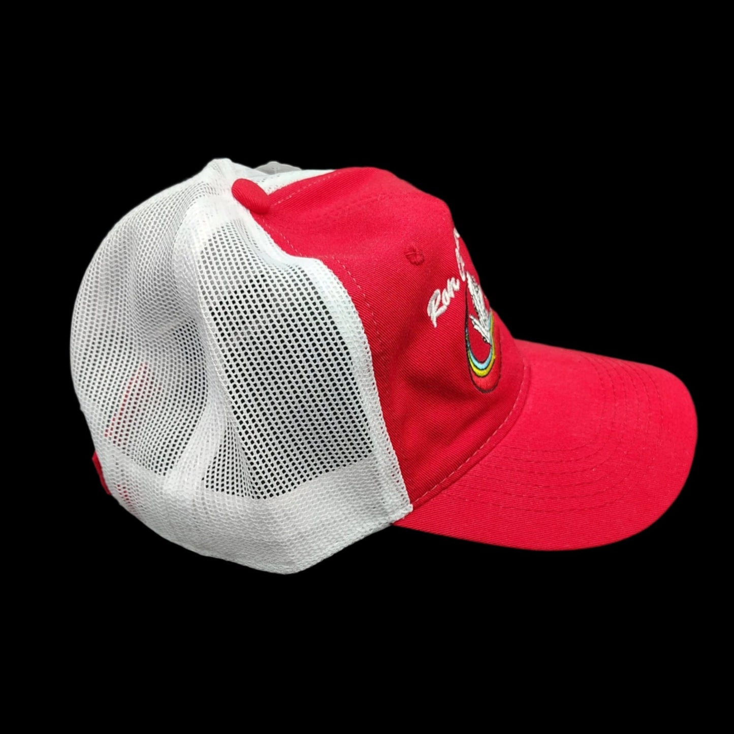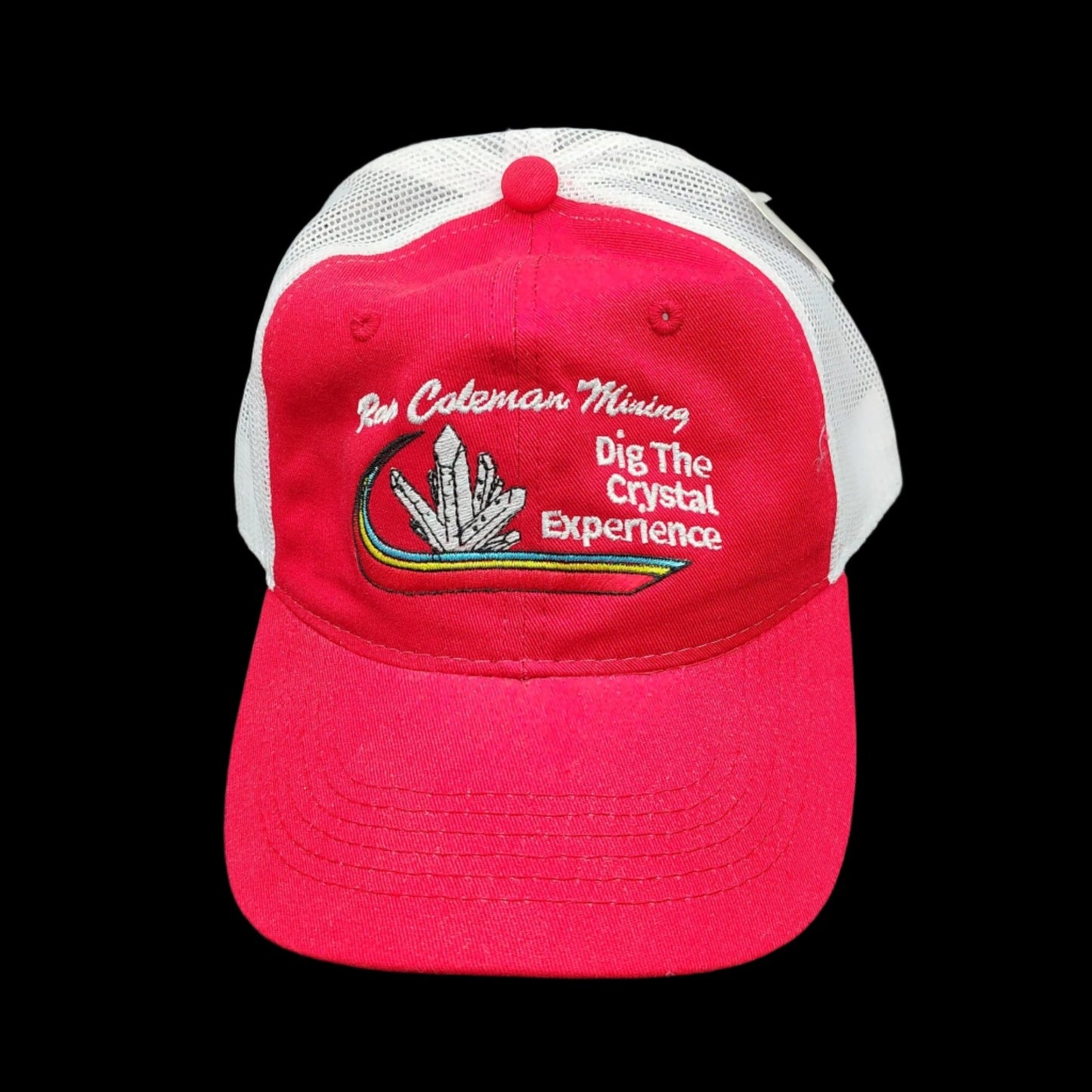 This unisex Ron Coleman Mining Souvenir baseball cap/hat has red fabric on the bill. The netting is white, and the Velcro closure is red. The graphics on this hat include Ron Coleman Mining Dig the Crystal Experience in White and a rainbow accent.