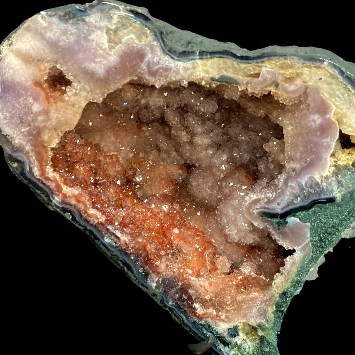 This Rose Amethyst (known as pink amethyst) specimen is a great display piece! It is a good size with purple, white, and pink drusy on the top left and right sides. In the middle of this piece is a shiny deep green, and the sides and back have been painted a flat black. This piece can be beautifully displayed in your home or at your office.
