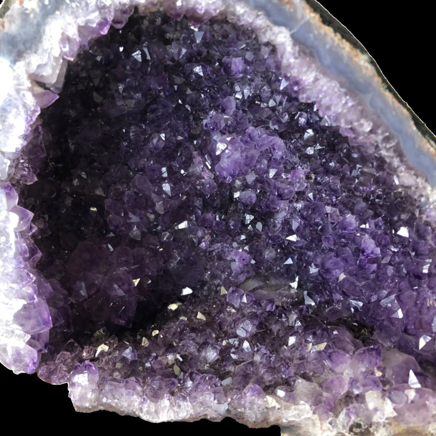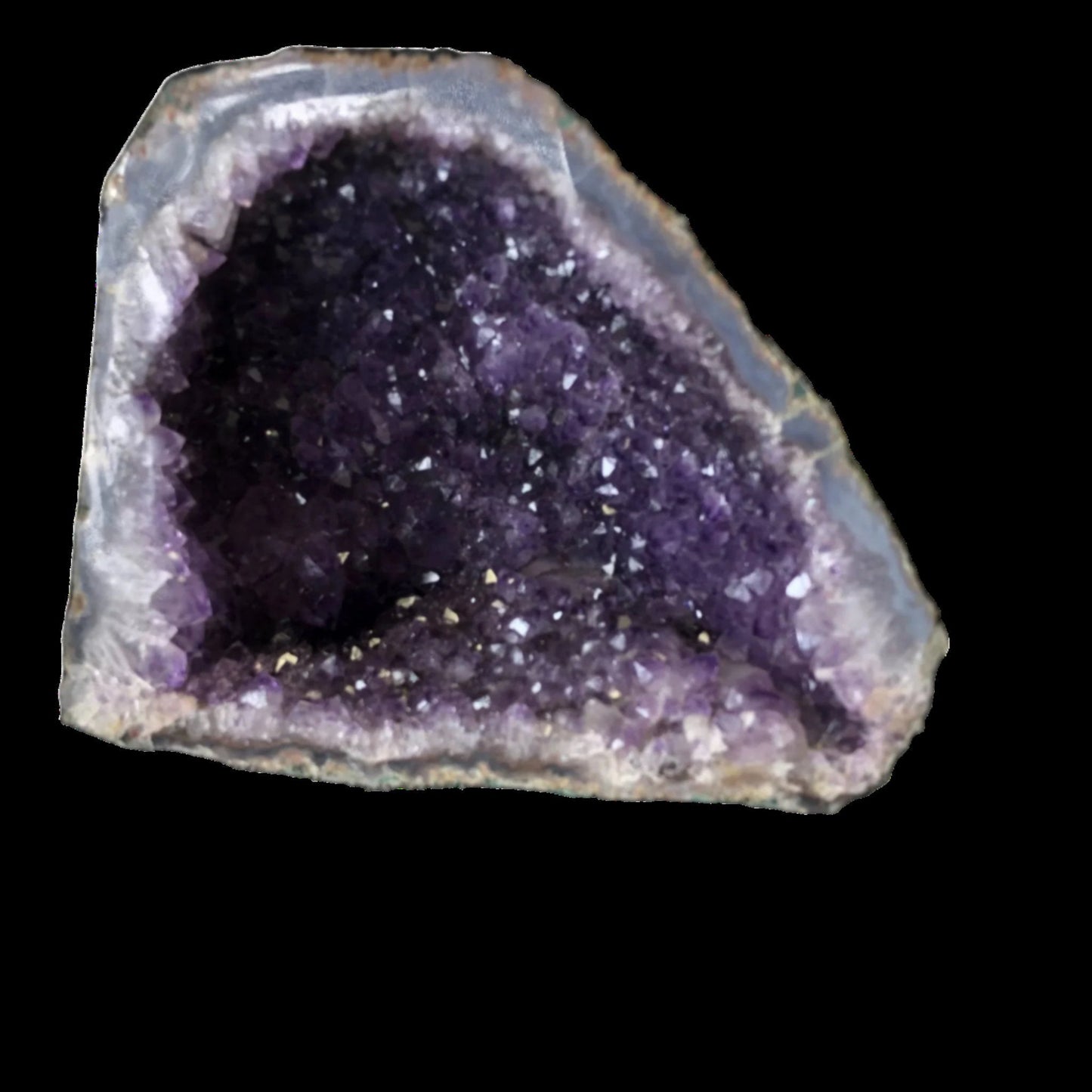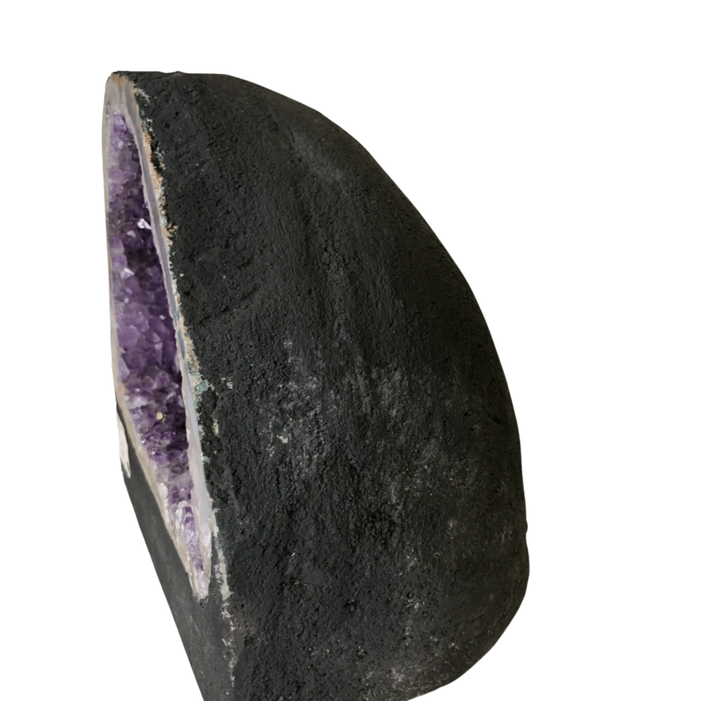 This is a small Amethyst half geode cathedral with lovely purple quartz crystals throughout the specimen. Amethyst is a purple quartz mineral that opens the third Chakra eye. The third eye is considered to be a source of power and wisdom. Crystal practitioners believe a person can use amethysts to enhance or sharpen spiritual visions and enlightenment. Purple is considered a royal color and can easily be a substitute for the usual interior decor touch of red in a space. Feng Shui healing element - Earth.