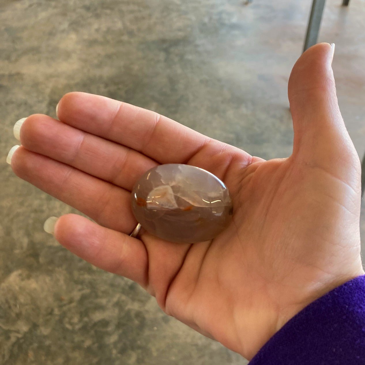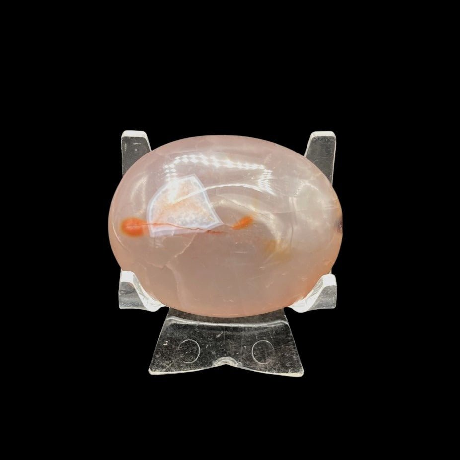 This Carnelian palm stone is a beautiful example of how unique the Carnelian stone is. This particular specimen has an allover pink hue. It has a small amount of gold and orange sporadically throughout it.