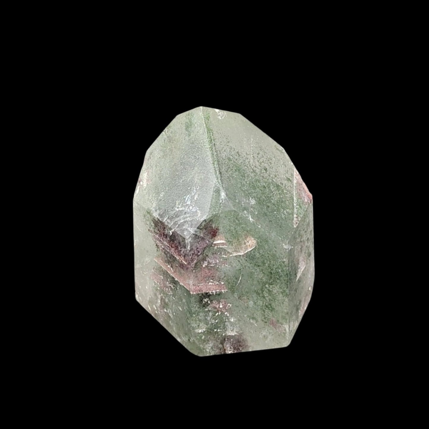 This beautiful quartz specimen is a chlorite-included quartz that has been cut and polished. The cutting is designed to bring out the beauty of the mineral. It is a natural quartz stone. However, the point was not formed naturally. A skilled craftsman handles the cutting and polishing. Chlorite Quartz is considered to be a powerful cleansing stone that removes negative energy from the space it is placed.