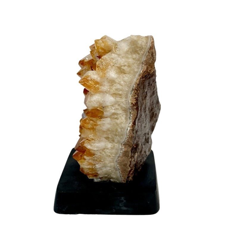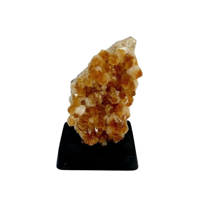 Make the bold move and decorate your home with this unique citrine quartz crystal cluster on a wooden stand! Ignite your living space with its beautiful color and stand out from the crowd. Its captivating aura will spark new ideas and fill your home with positive energy. Take the leap and feel its power!