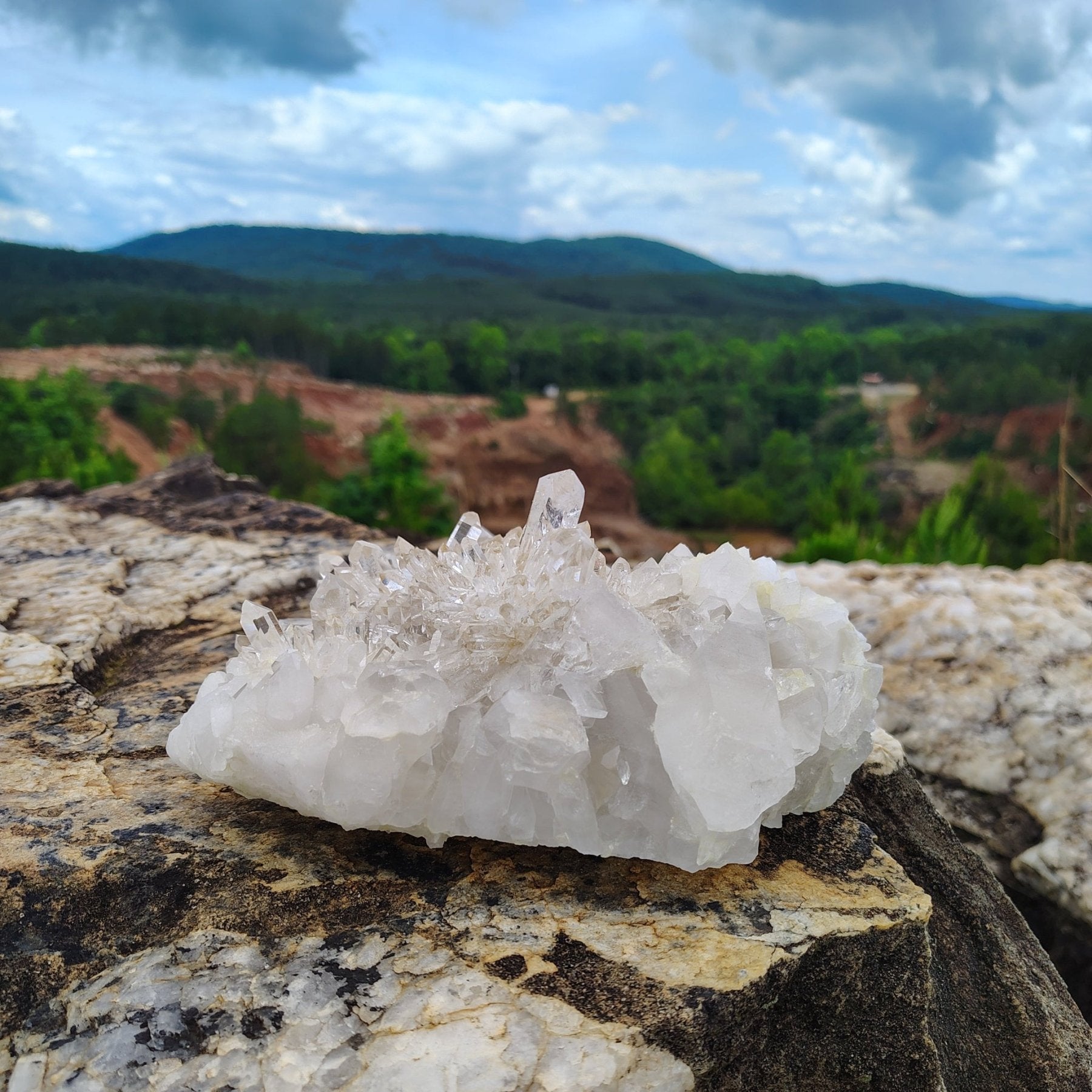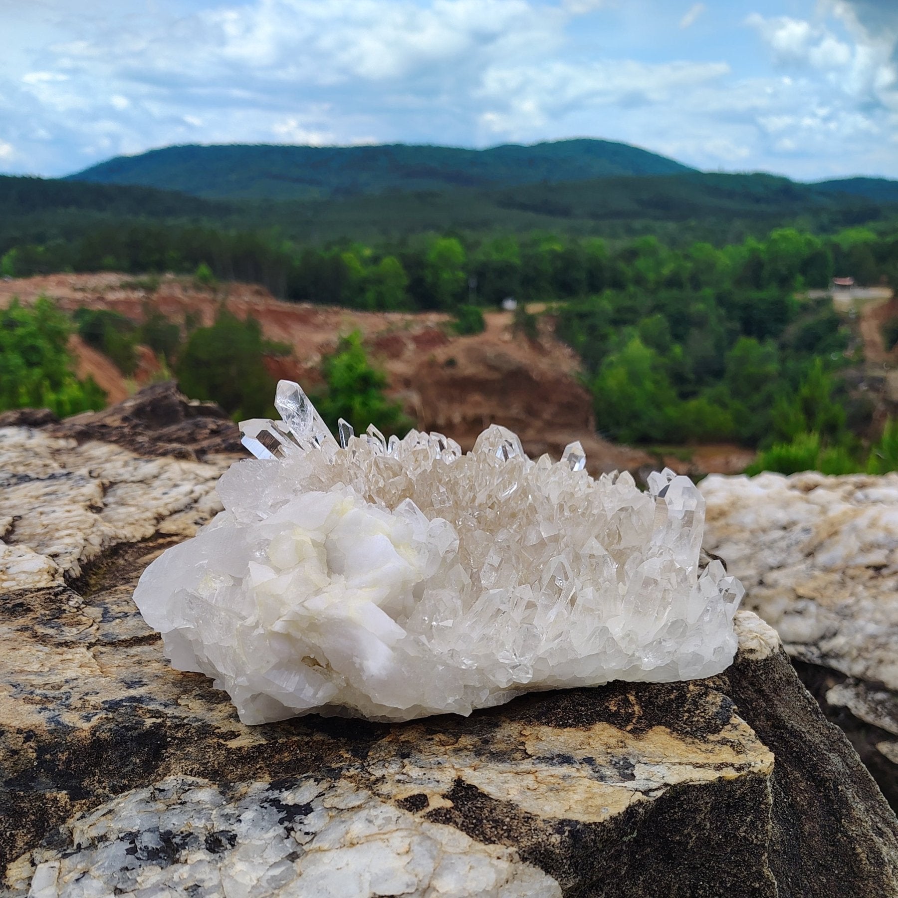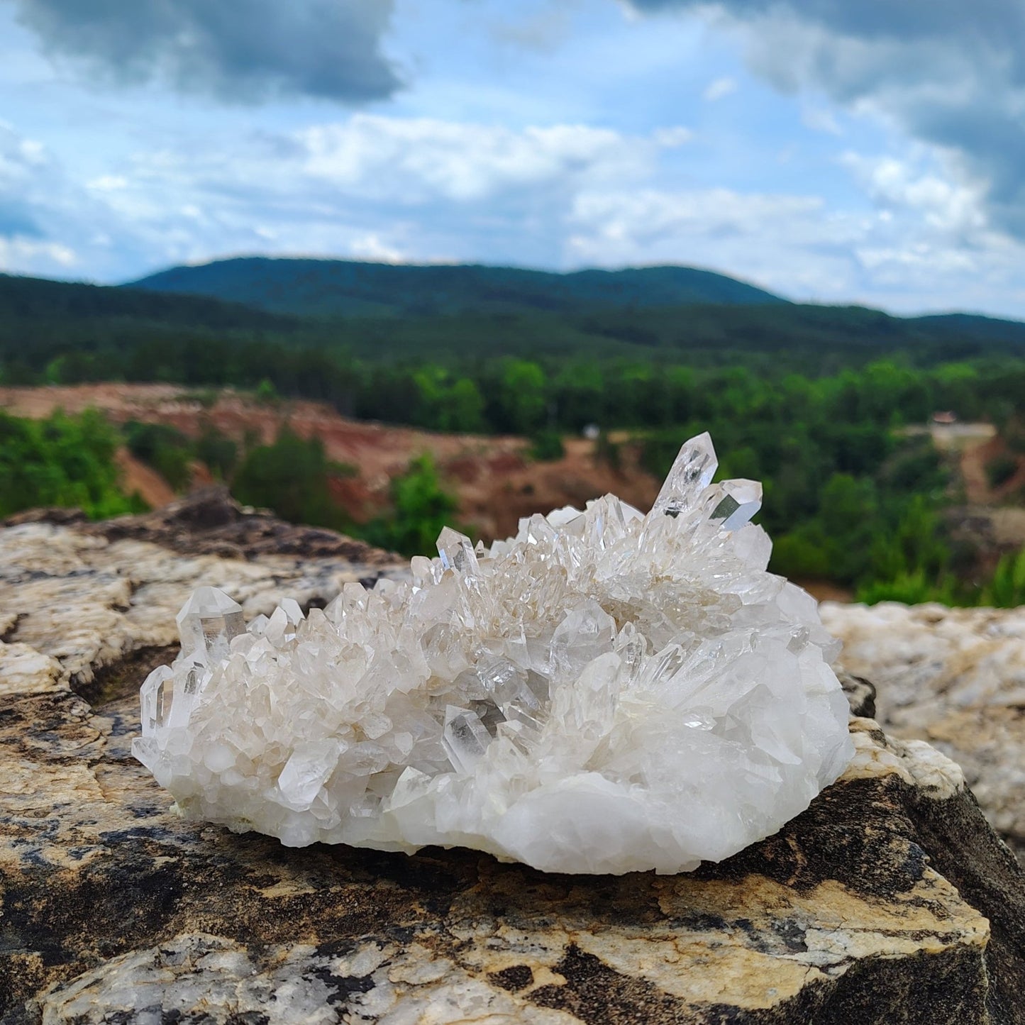 You can buy Ron Coleman-mined quartz online, in-store, and in many retail locations. This Arkansas quartz crystal cluster has multiple crystal points. The crystal formations on this cluster are breathtaking. This is a high-energy, healed crystal—a beautiful sparkling home decor accessory for a fireplace mantle, tabletop, bookshelf, or office. Metaphysical belief is that healed crystals have healing properties. The pink tone in some of the crystal points is iron that grew within the quartz.