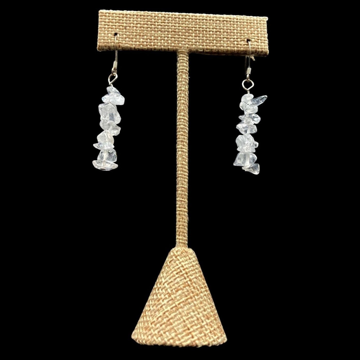 On each Quartz crystal drop earring, there are 7 to 8 water-clear Quartz crystal chip beads attached to a 2-inch silver pin and silver ear hook.