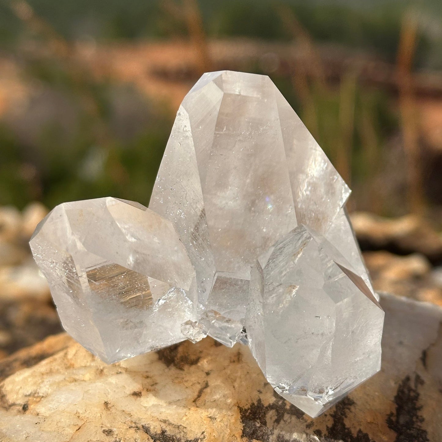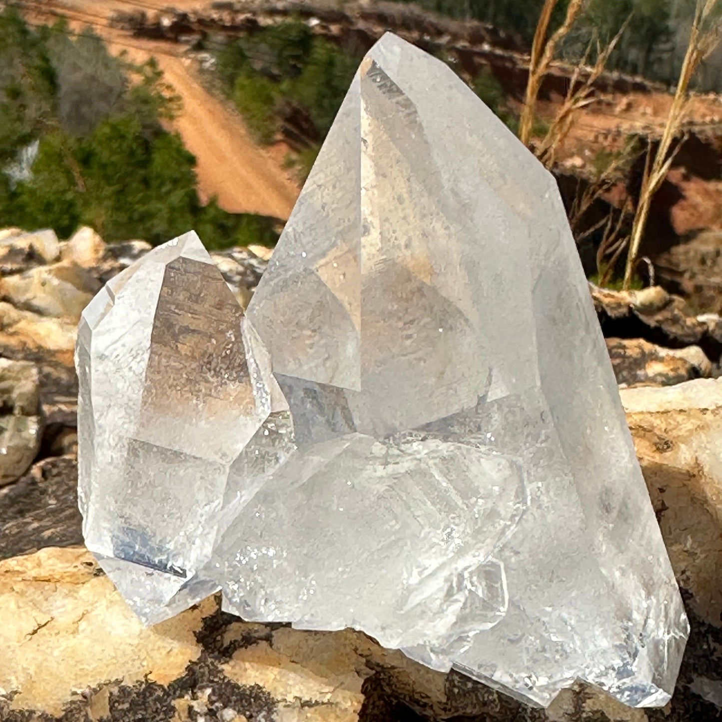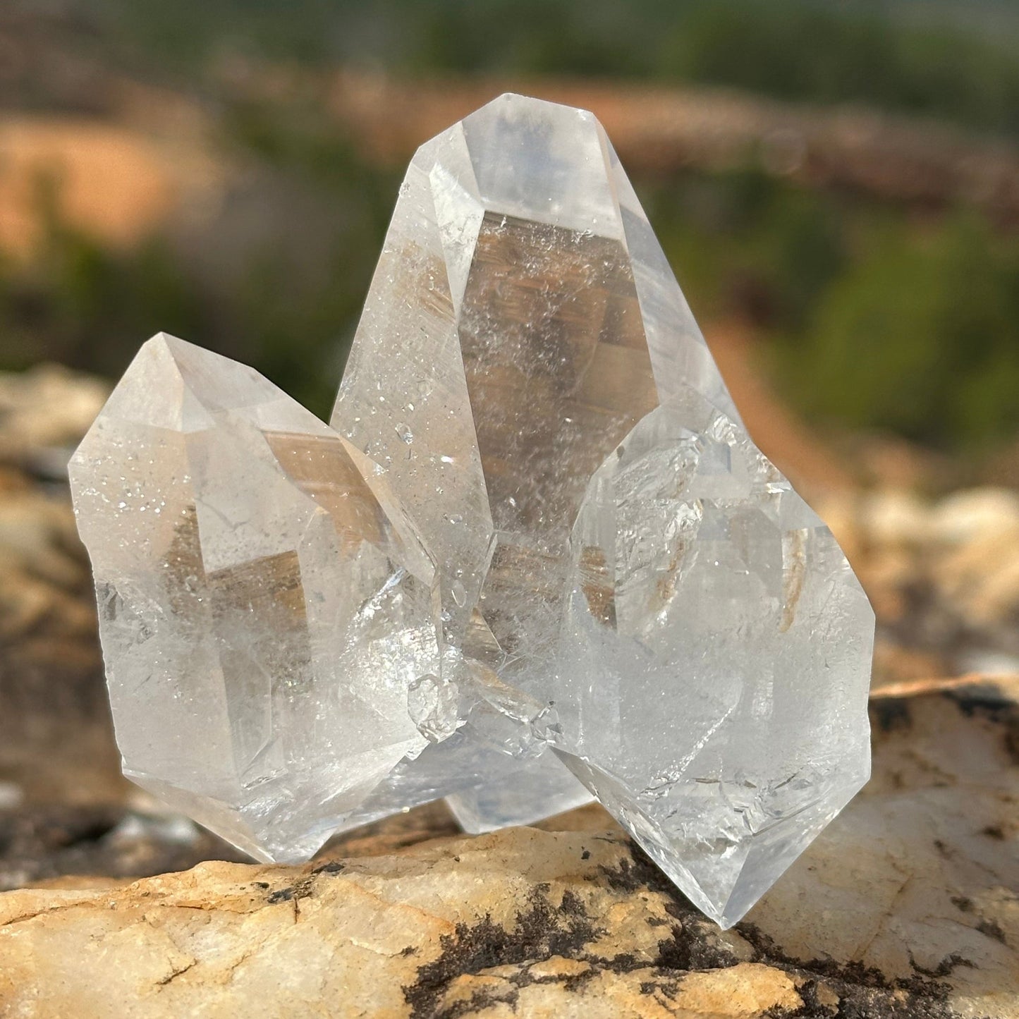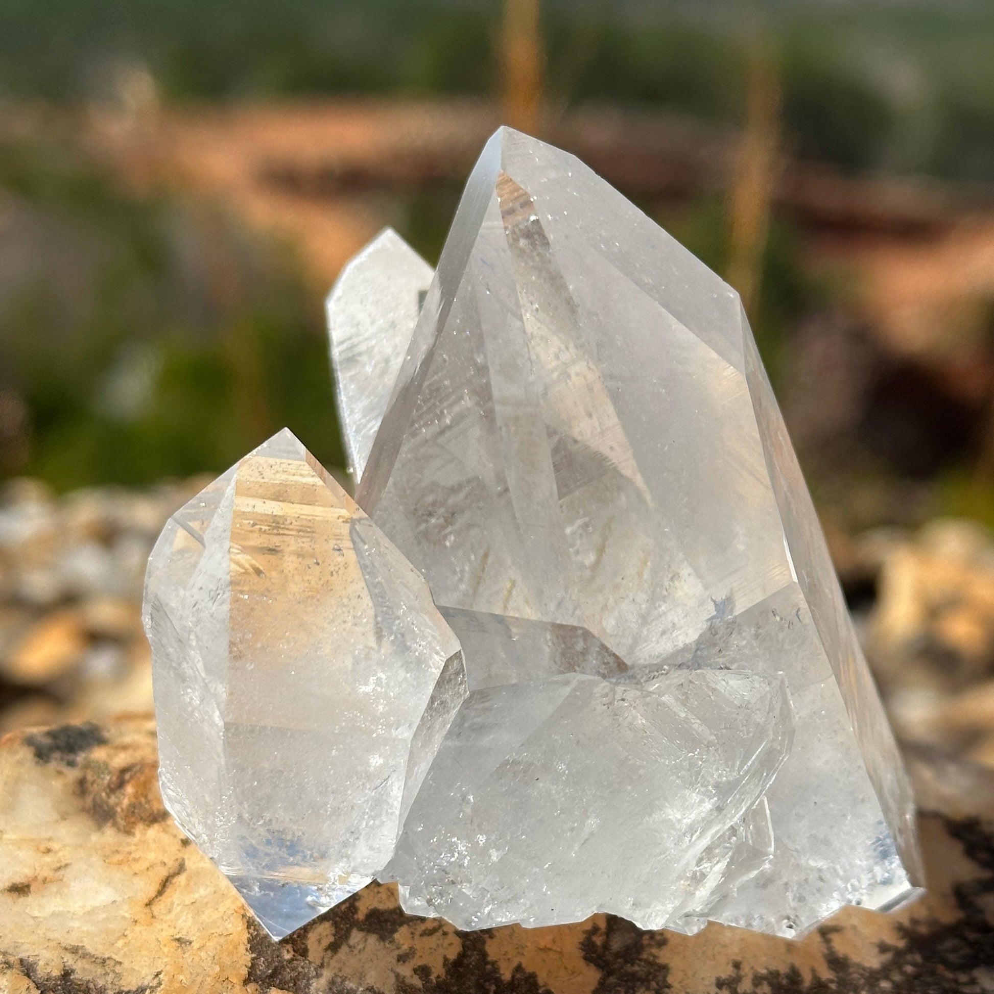 This is a beautiful, clear quartz crystal cluster of the finest quality. Use this rock specimen as a home decor accessory for energy healing. Use Southeast Bagua placement as a Feng Shui cure for wealth and abundance. All quartz crystal points and clusters sold are hand-dug, rinsed with spring water that flows through our mine, soaked in oxalic acid, and rinsed again. These are not cut and polished.