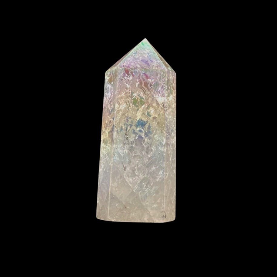 The Aura Crackle quartz is a uniquely beautiful rock specimen to add to any collection. Its rainbow tone shimmers intensely through all the cracks throughout the crystal tower point.