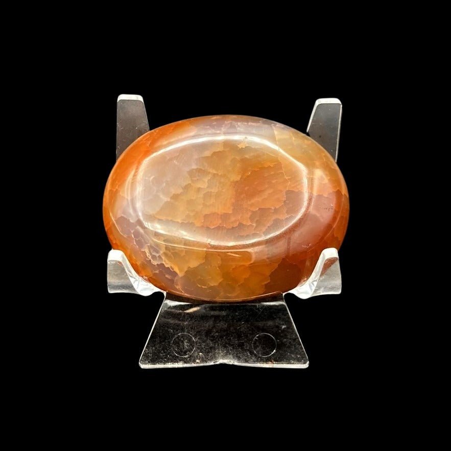 This Carnelian palm stone is oval shaped. The colors and patterns of this type of palm stone can be compared to a sunset. The colors change gradually in the shades of orange, red, and then grey blue to white.
