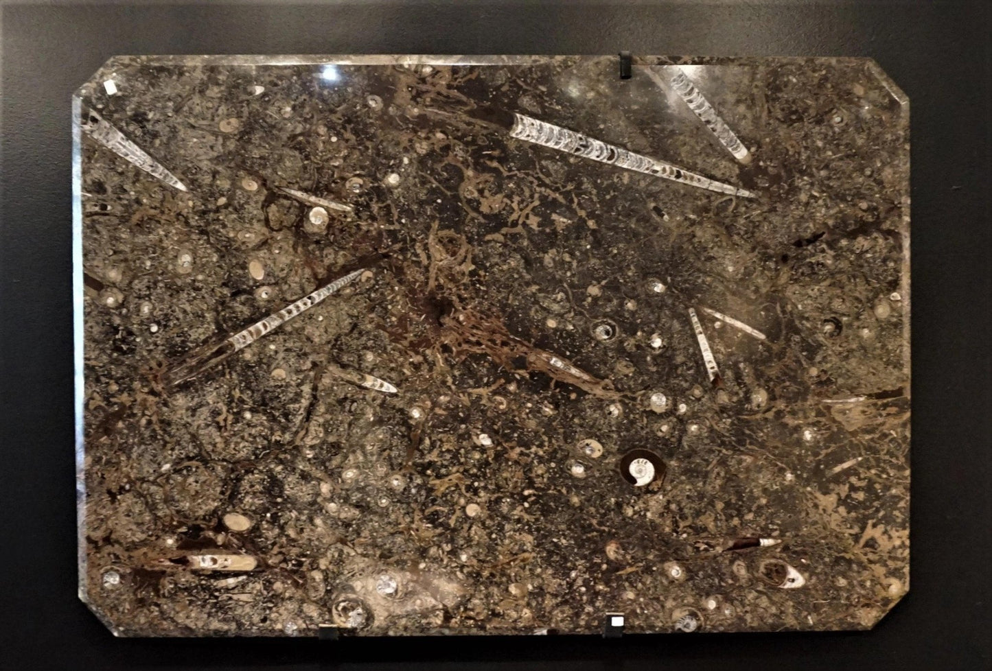 Amazing, authentic, and unique tabletop or wall hanging petrified remains of Ammonites and Orthoceras. A metal smith could make an ornate frame for this to be used as a wall hanging.