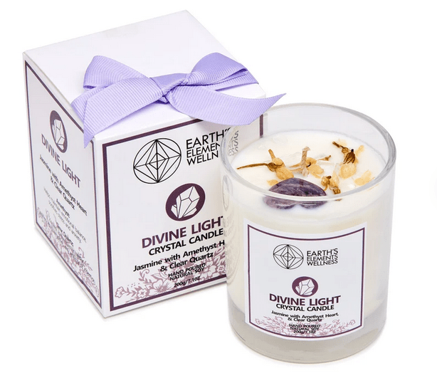 This is an Earth's Elements Divine Light Crystal Candle with a Jasmine scent, Amethyst heart and Clear Quartz crystals. The gift box is included with your purchase.