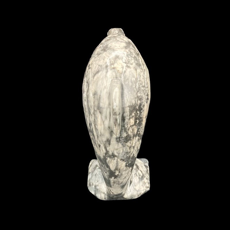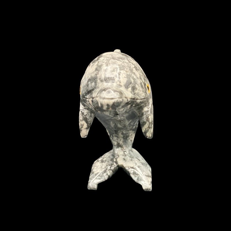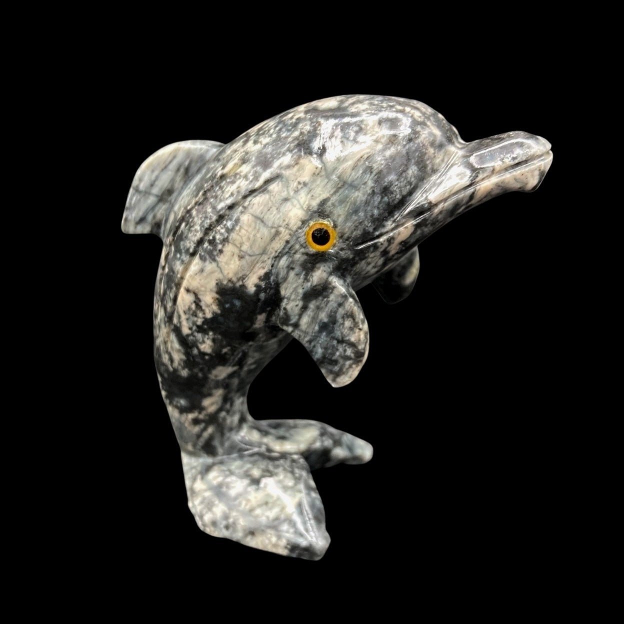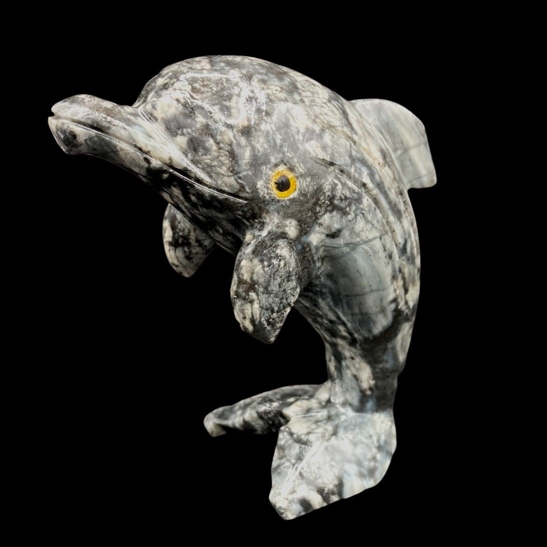 This is a really cute Dolphin figurine. This figurine is made of Soapstone and is blue gray in color. This dolphin figurine is standing up in the air on his tail.