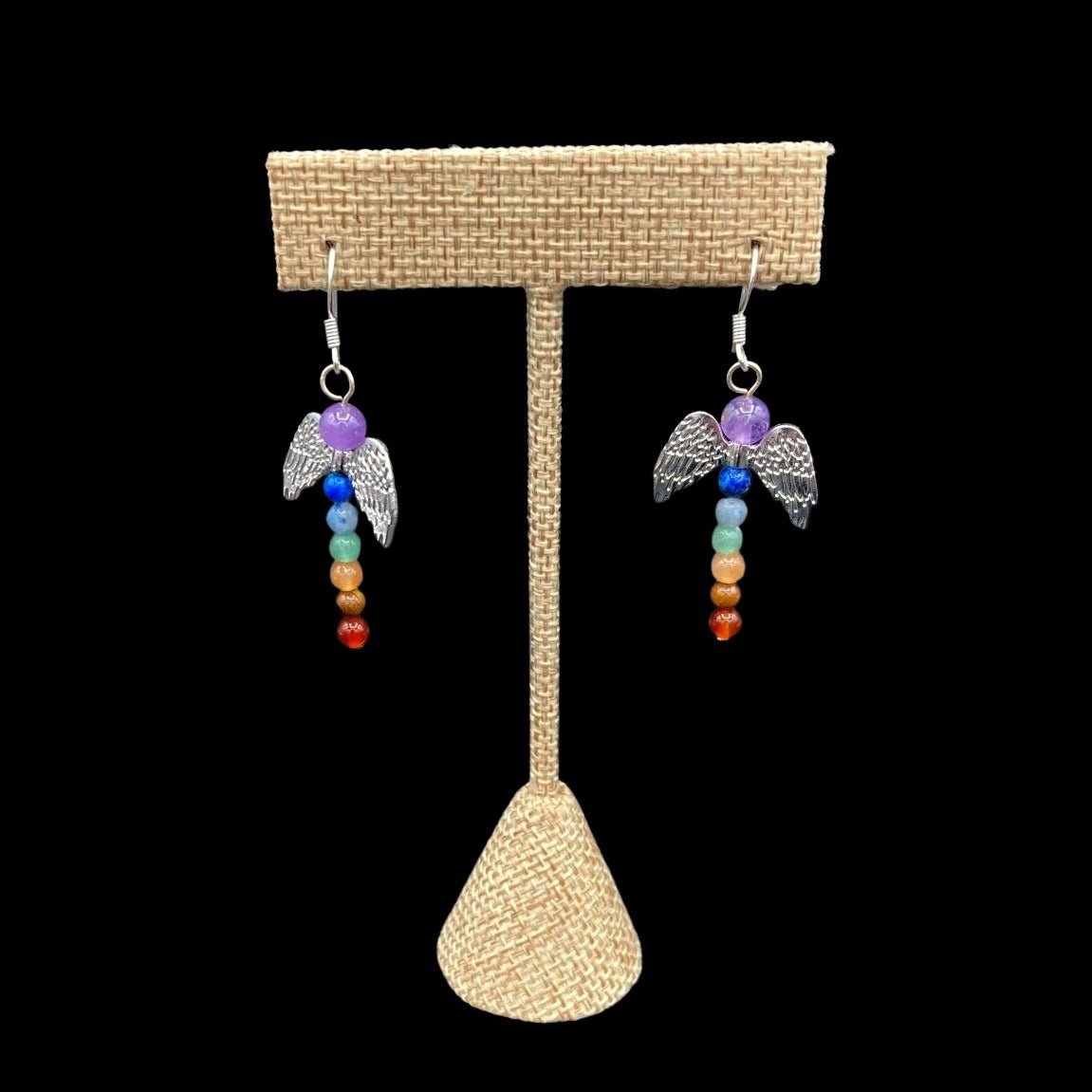 These angel earrings, featuring genuine 7 Chakra stones, are pierced and dangle style. The ear hooks, the wire to which all the beads are fastened, and the embellishments are all silver. Each earring features a silver bead in the form of angel wings in flight, accompanied by seven additional beads per earring, each in the color of one of the seven chakras.