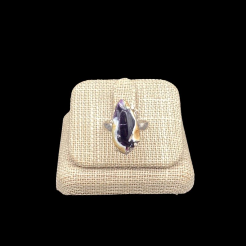 Enjoy wearing a touch of color! Cabochon cut, pear shape purple Opal stone set in a sterling silver, prong set, minimalist ring. The delicate silver wire is intertwined to create a timeless design. Wear it day or night for a regal addition to your style. The natural color tones displayed on the purple opal are white, cream, tan and deep purple.