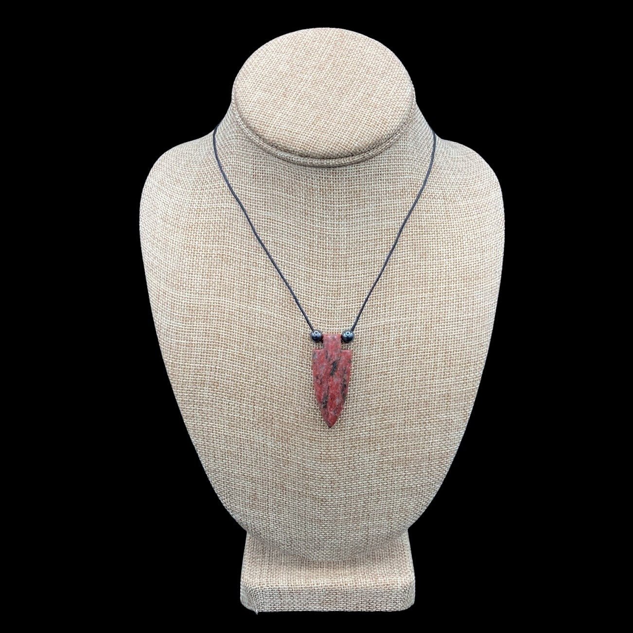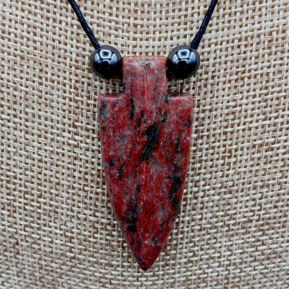 This jewelry consists of a black corded pull string, a one-size-fits-most necklace, and a pendant made of red jasper, which is carved as an arrowhead.