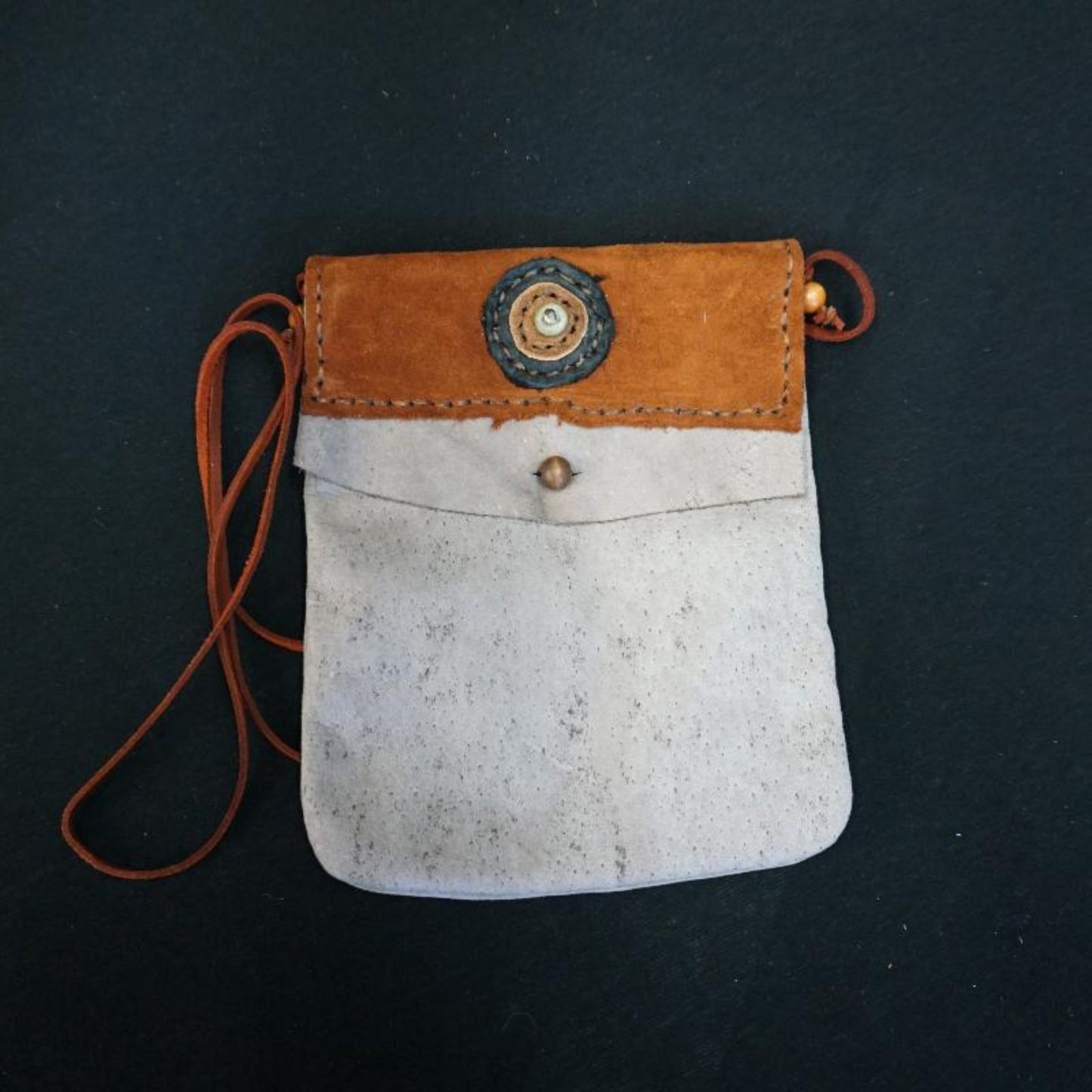 Handmade leather satchel purse with shoulder strap was made here in Arkansas. This leather purse is a unique color and features a circular leather design. Large enough to hold a cellphone or carry your favorite rocks with you wherever you go! Colors are cream, brown/tan and black.