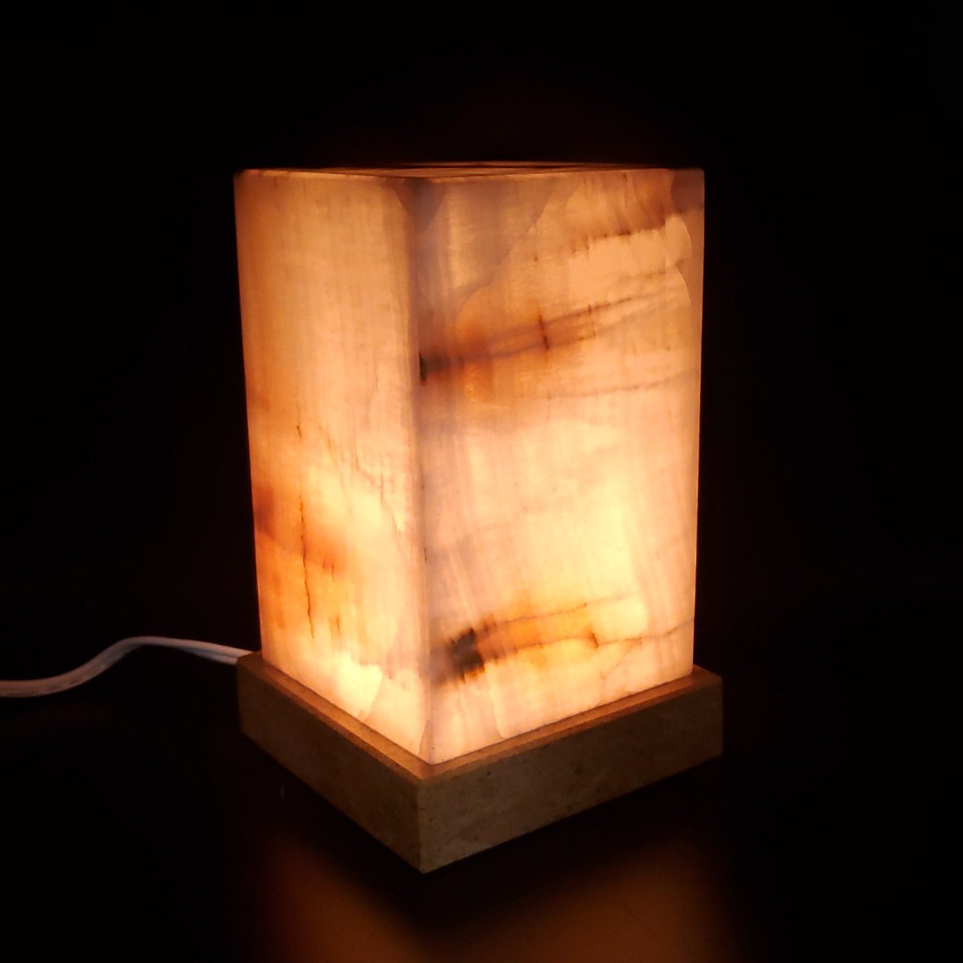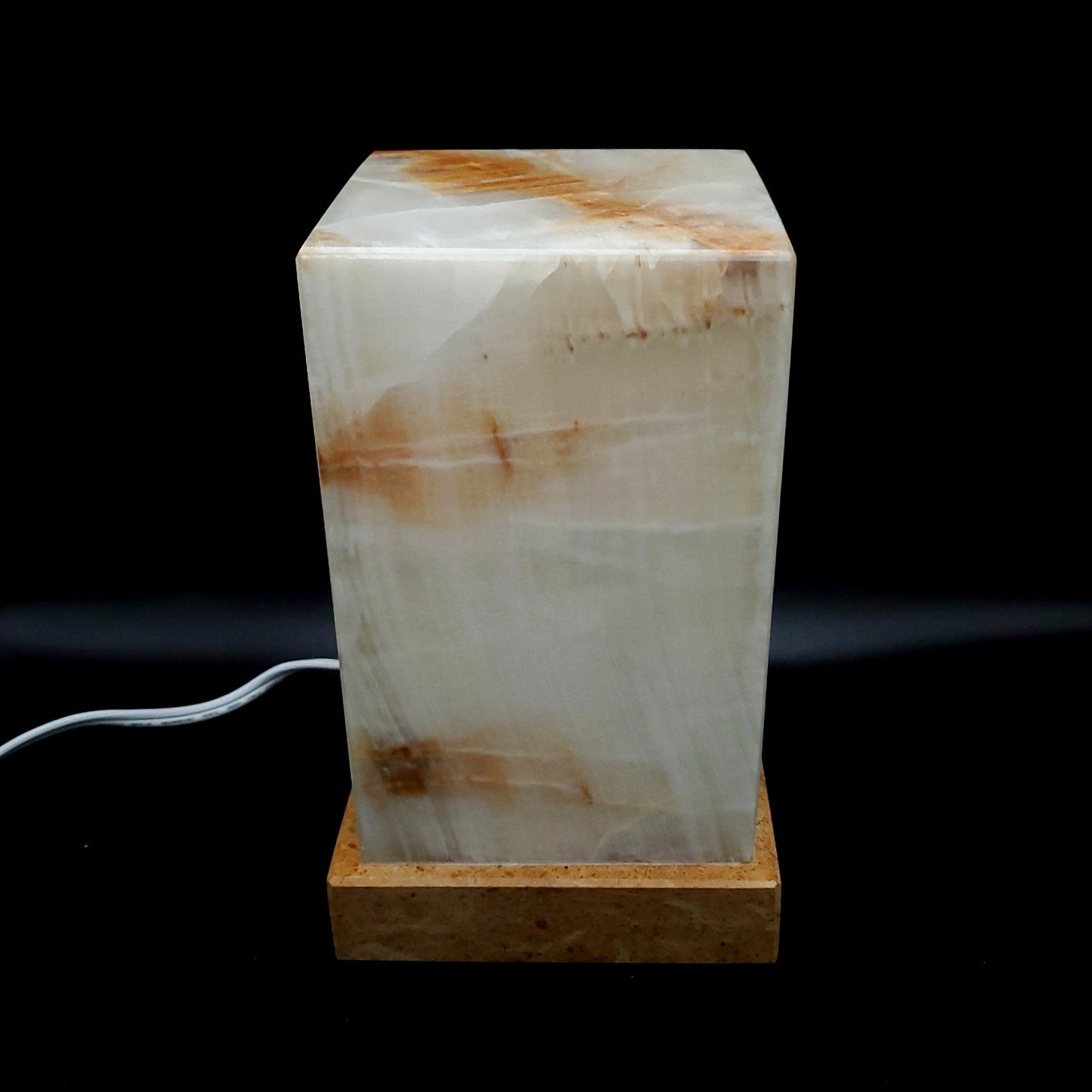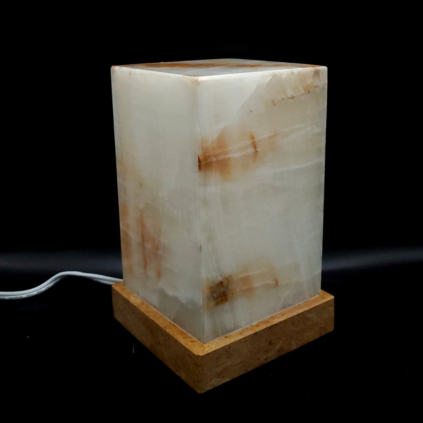 This is a beautiful, natural, carved Onyx stone rectangular lamp. The natural tones of onyx are beige, cream, brown, tan, green, and light red. This lamp will create lovely ambient lighting in your space. As this is a natural stone, the lamp you receive will vary in pattern and color. A cord with a switch and a 7-watt bulb is included.