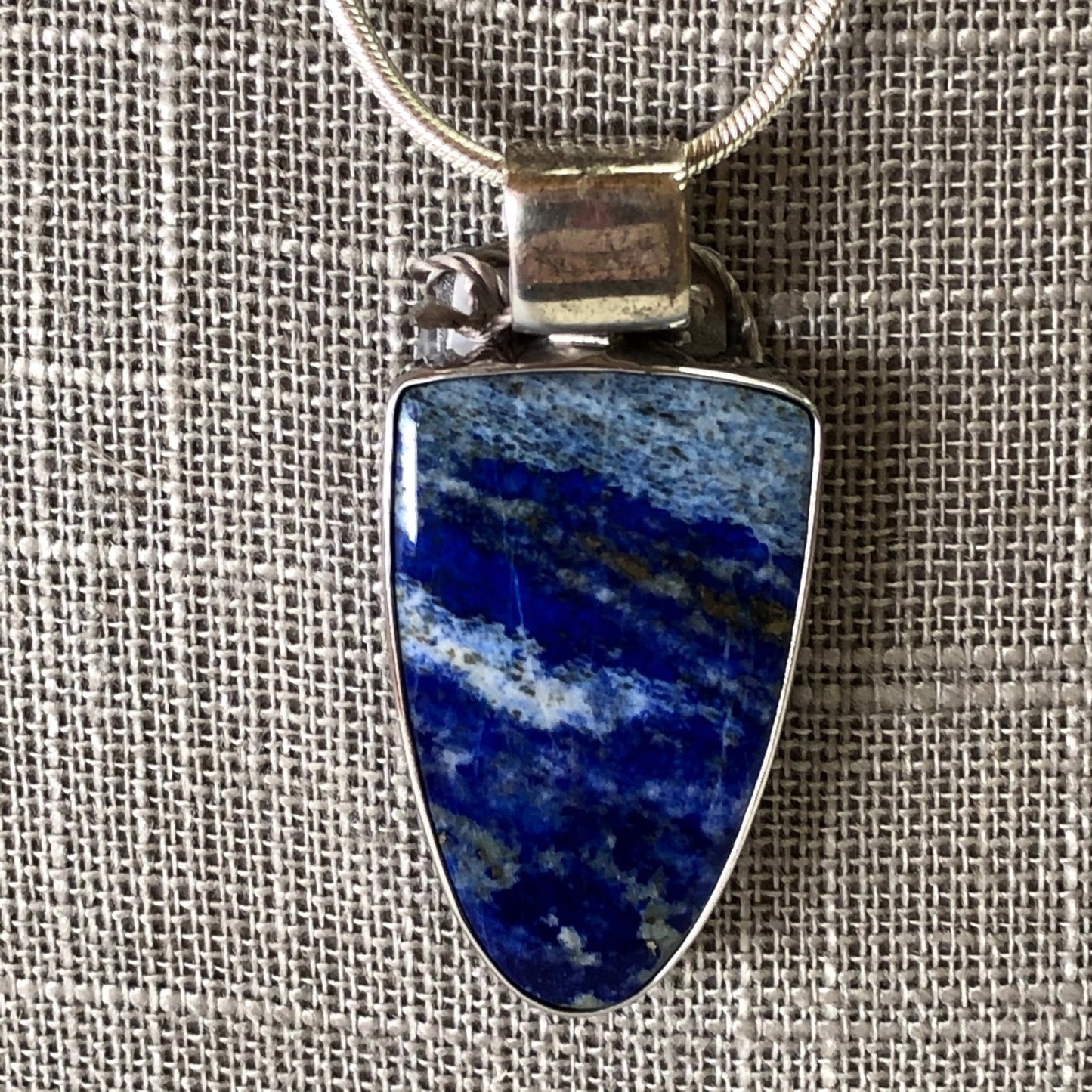 Should you give her a gift she can wear every day? This beautiful pendant on an 18" snake chain features a lovely blue Lapis Lazuli, cabochon cut stone that is bezel set in sterling silver (925). Bezel setting refers to a solid sheet of metal that is formed around the entire circumference of the gemstone. This particular Lapis gemstone also has a beautiful pattern of calcite matrix that runs throughout the stone, giving it the appearance of stone layers as seen in the southwest United States.
