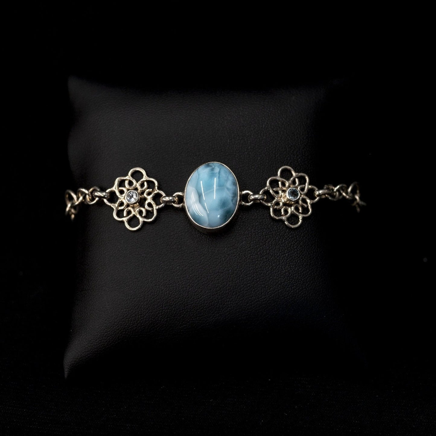 This sterling silver chain bracelet features an oval Larimar cabochon—vibrant blue genuine stone bracelet Boho style jewelry.  There are also bezel-set Blue Topaz round brilliant cut stones set in silver on the sterling designs on either side of the Larimar.  Larimar is a rare gemstone known as the stone of the Caribbean.  The bracelet length is adjustable.  Experience the beauty of a one-of-a-kind Larimar bracelet and celebrate the unique elegance of the Larimar stone.  Adorn your wrist with the delicate silver chain and deep blue stone, adjustable for a perfect fit.  This exquisite piece of jewelry brings a sense of confidence and timeless style to any look.