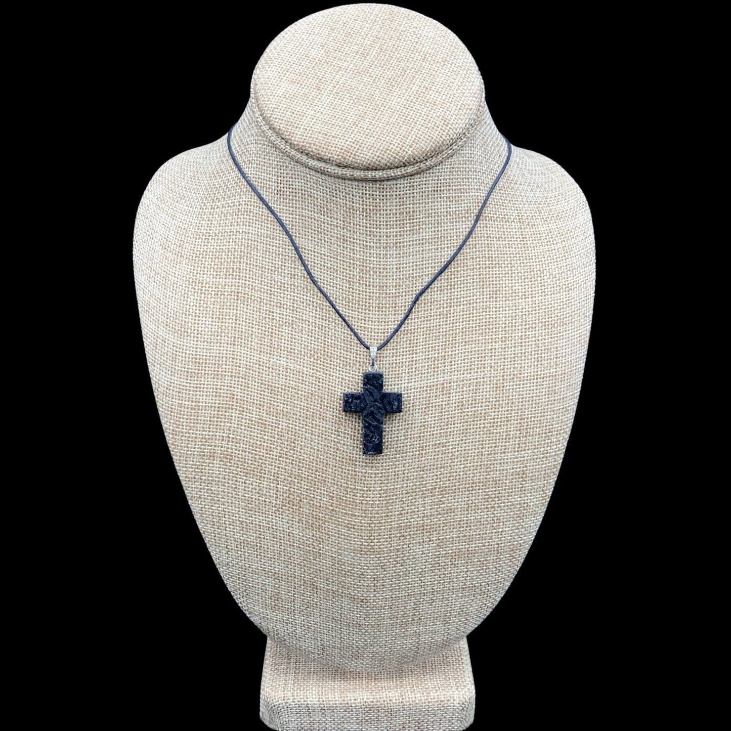 This necklace has a cross pendant that is carved out of raw Lava rock and has a wavy, polished design on the front side of the cross. The necklace itself is on black cord that has knots incorporated on each side, which in turn makes it adjustable.