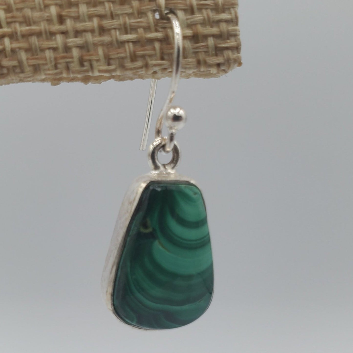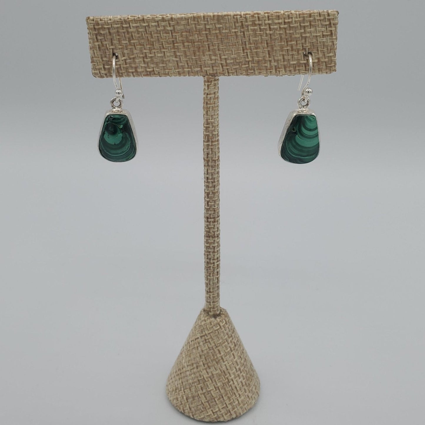 Beautiful French Wire Malachite sterling silver dangle earrings. The Malachite stone is approximately 1/2-inch-long x 1/4 inch at top and 5/8 inch at the bottom. Malachite is a lovely deep green. This stone is a highly polished free form shape that is bezel set. Bezel setting is a sheet of metal that follows the shape of the stone and is pushed over the edge of the stone to secure it. There are times epoxy is also used if the bezel is not tall enough to hold the stone.
