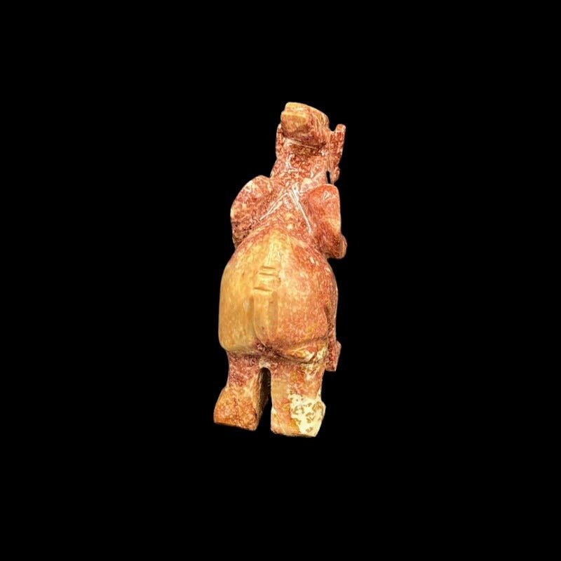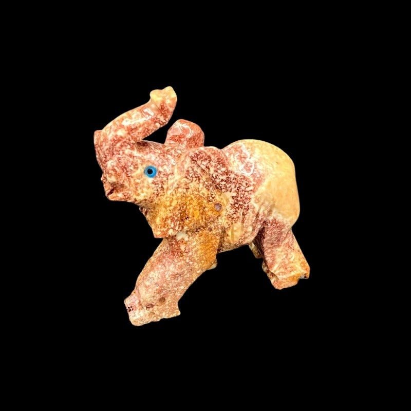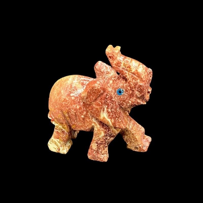 This intricate little elephant is sure to be a hit! Hand-carved from soapstone and polished to perfection, this medium red and orange marbled figurine adds an exotic flair to any home décor. Bring the majesty of the savannah to your living room with a one-of-a-kind soapstone elephant! Elephants with their trunk up are considered lucky. There are people who collect "savage" elephants. Consider this as a gift to a person who collects lucky elephants.