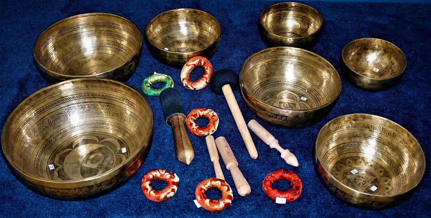 7 Chakra metal singing bowls are used for stress relief, meditation, and chanting. Cushions and 5 wands included. Handmade in Nepal