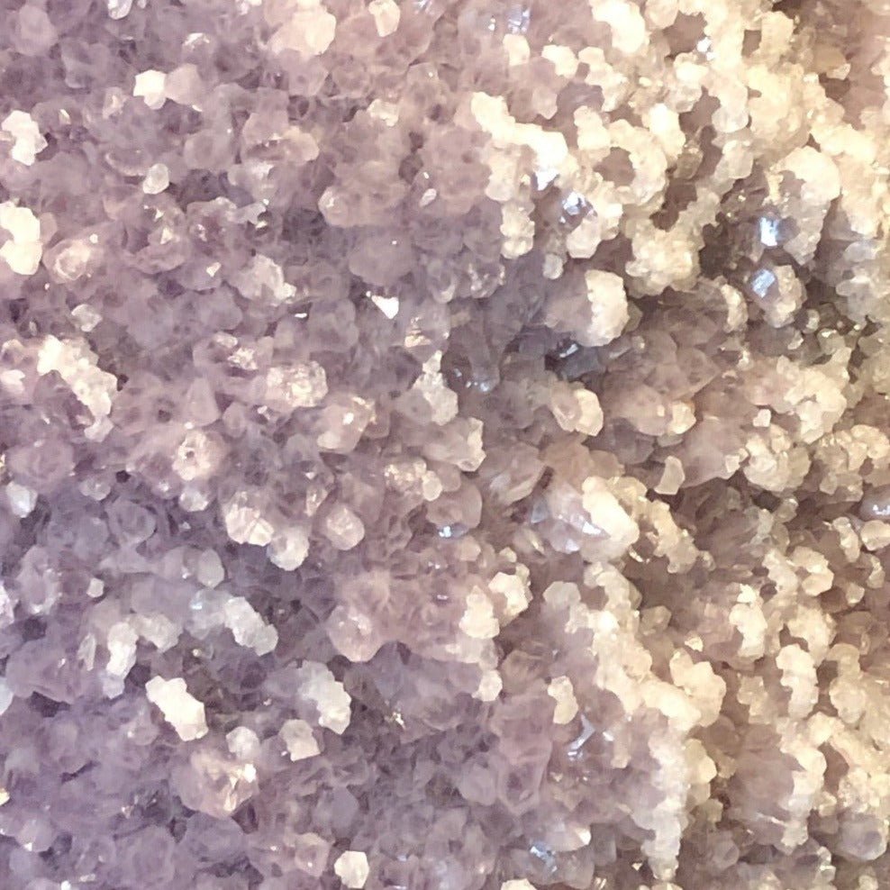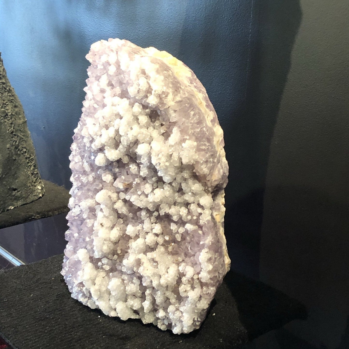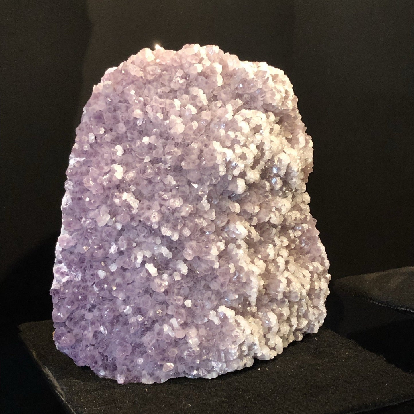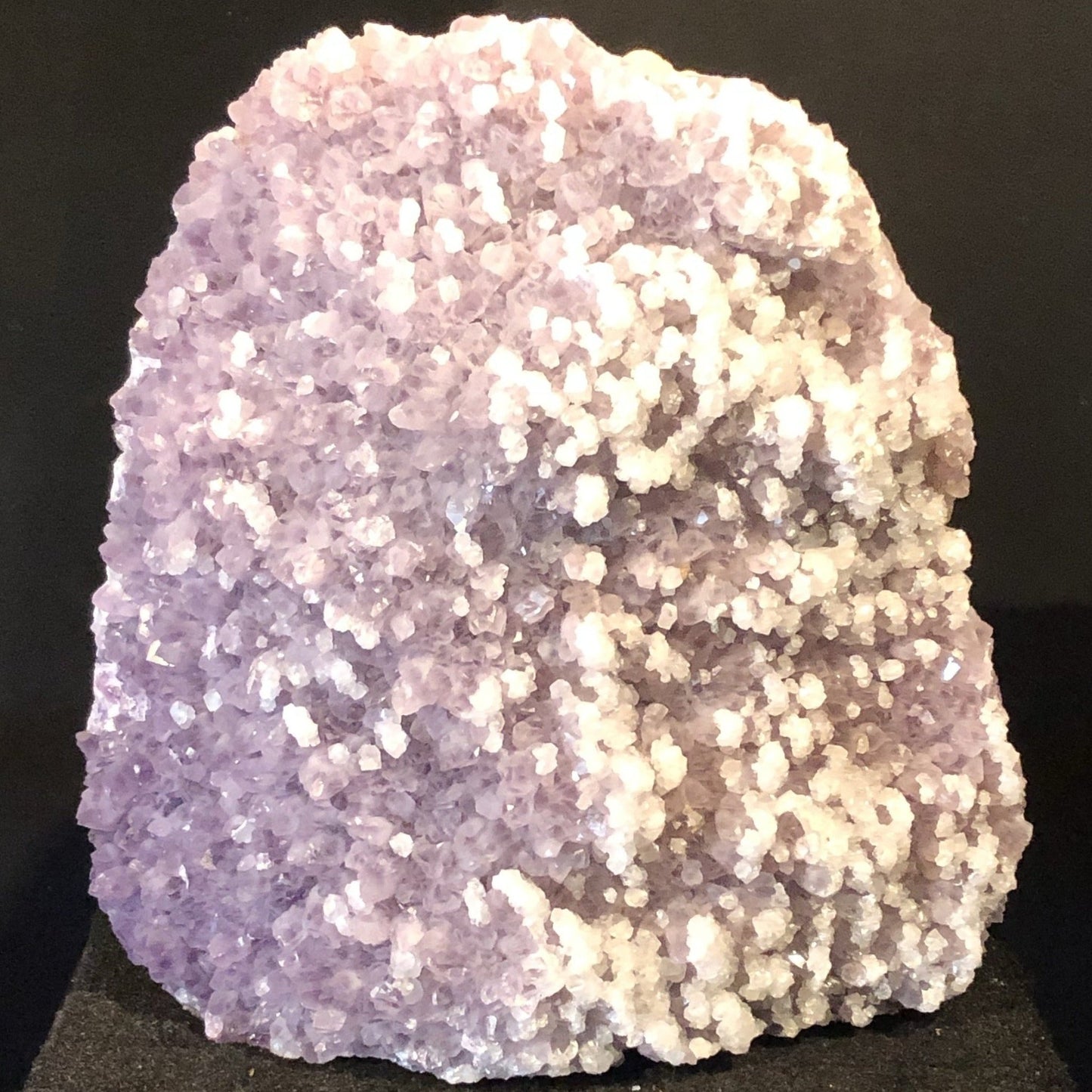 This beautiful botryoidal-shaped Mexican Amethyst specimen has natural white and purple colors. This large Mexican Amethyst drusy will sparkle in your home, office, or commercial space. The natural colors are pink, purple, and white. The flat bottom allows for stable sitting on a tabletop.