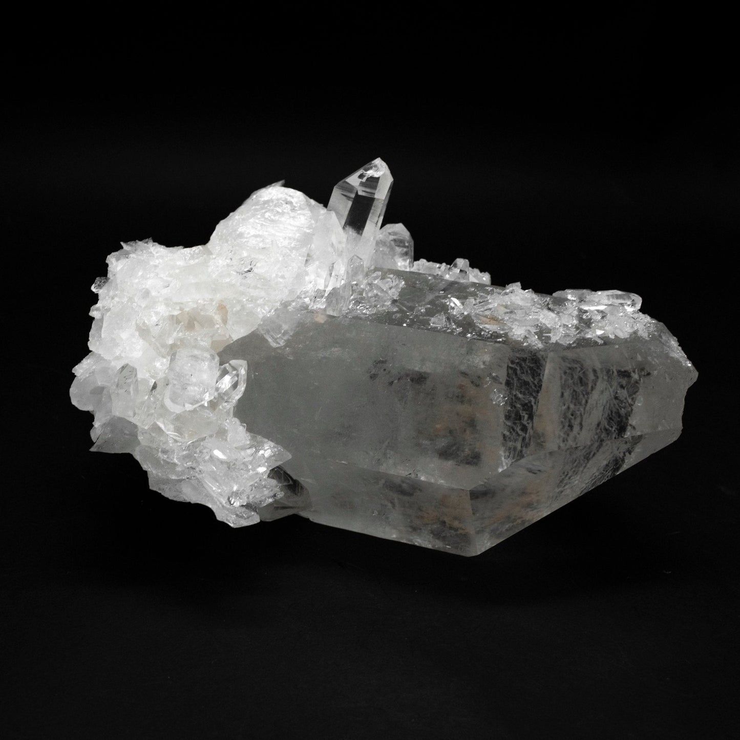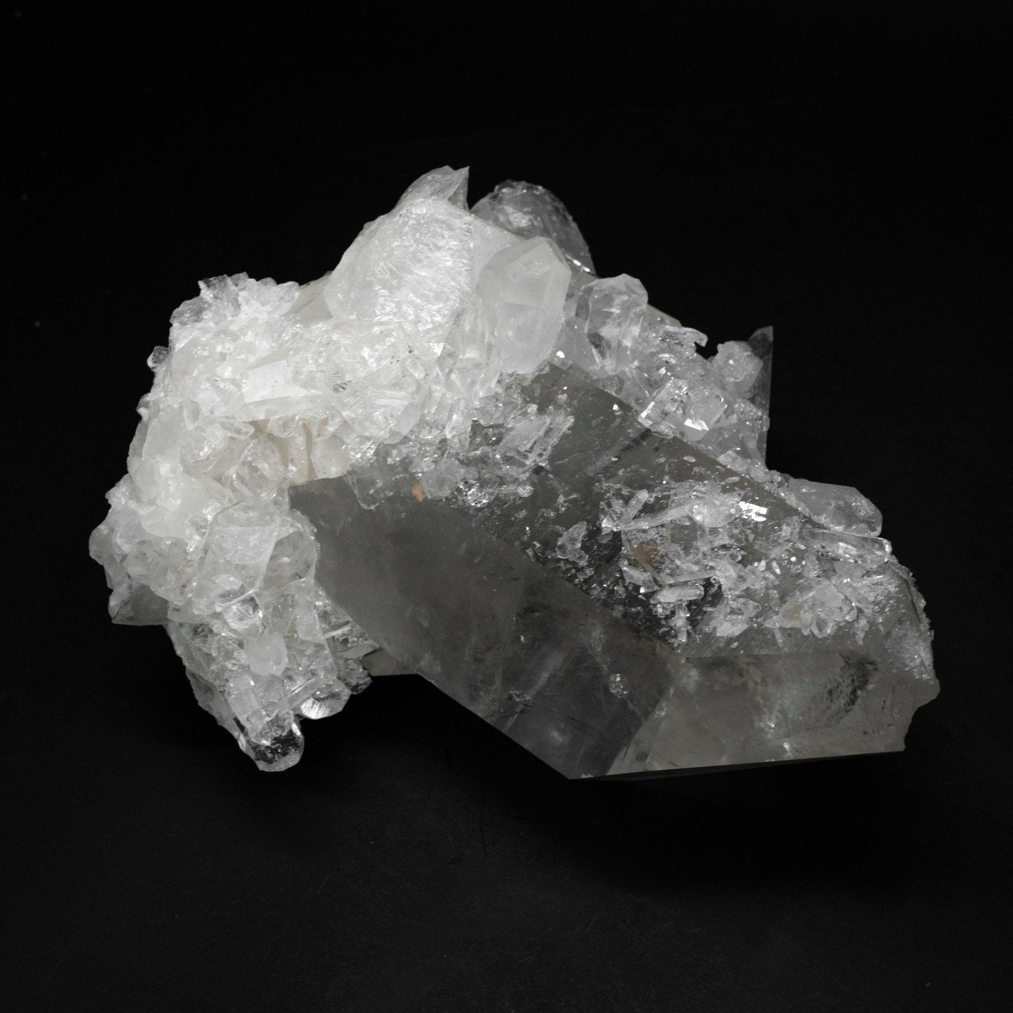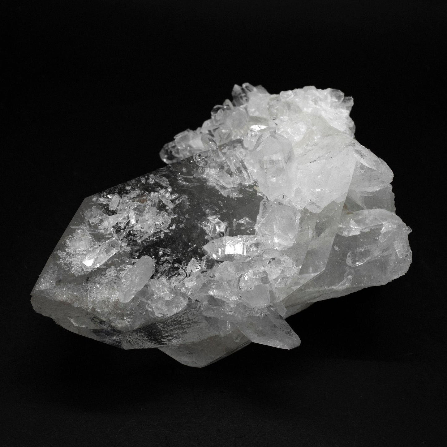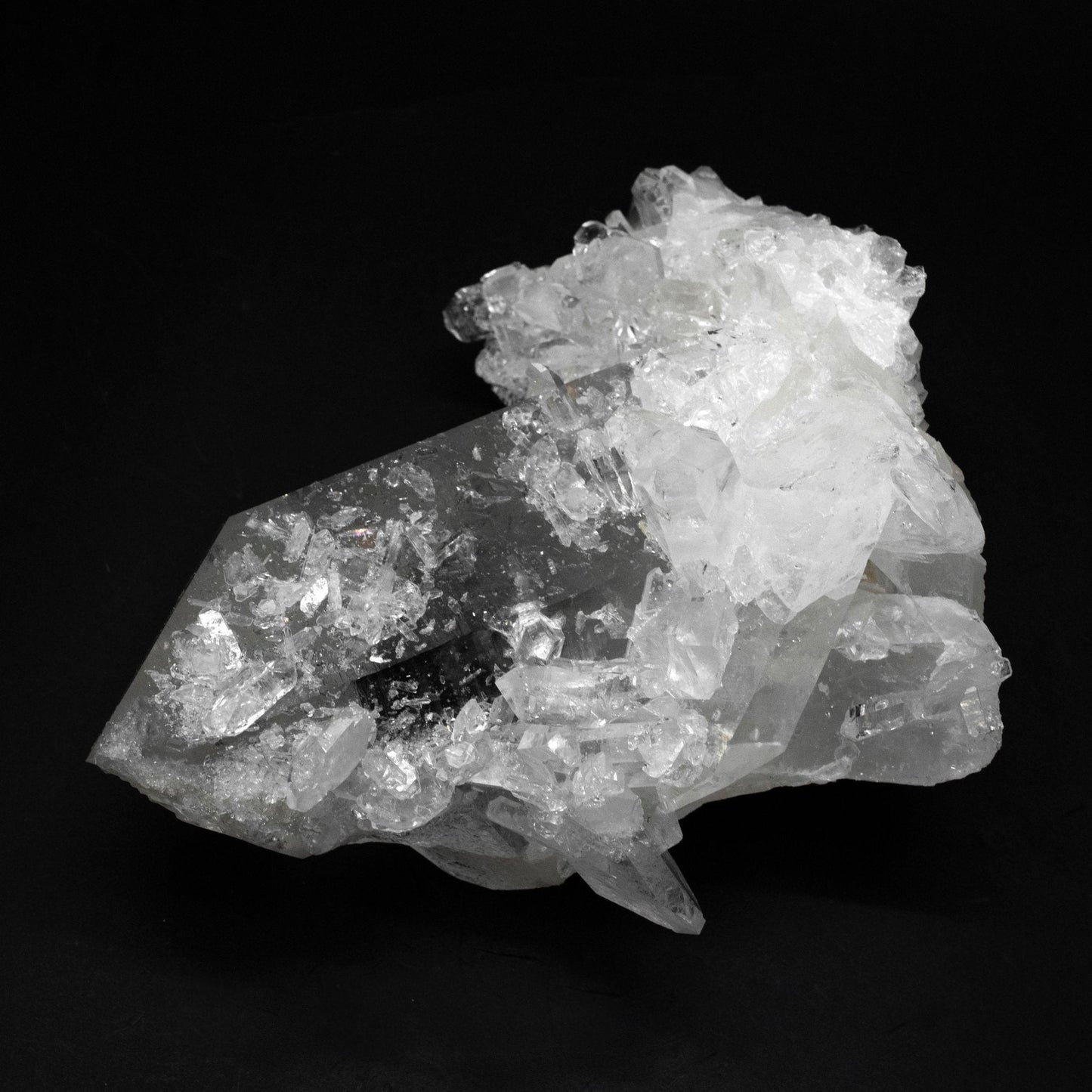 Beautiful pristine quartz crystal cluster from Ron Coleman mine in Arkansas.  All crystals from our mine are not cut or polished and have only been cleaned.  This sparkling mineral home decor specimen has multiple trigger point growths, fairy dust/snow, and a significant crystal point.  Highly collectible and very vibrating crystal.