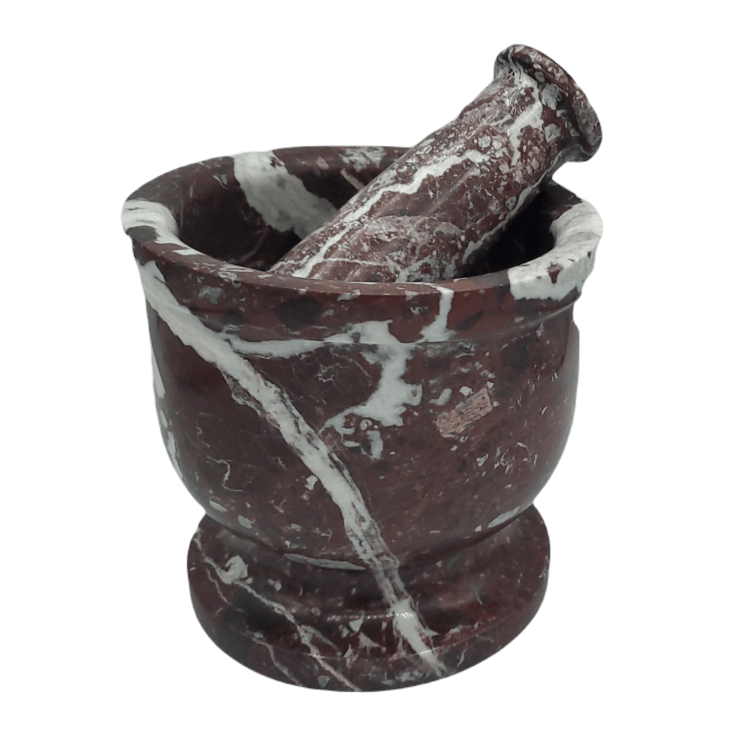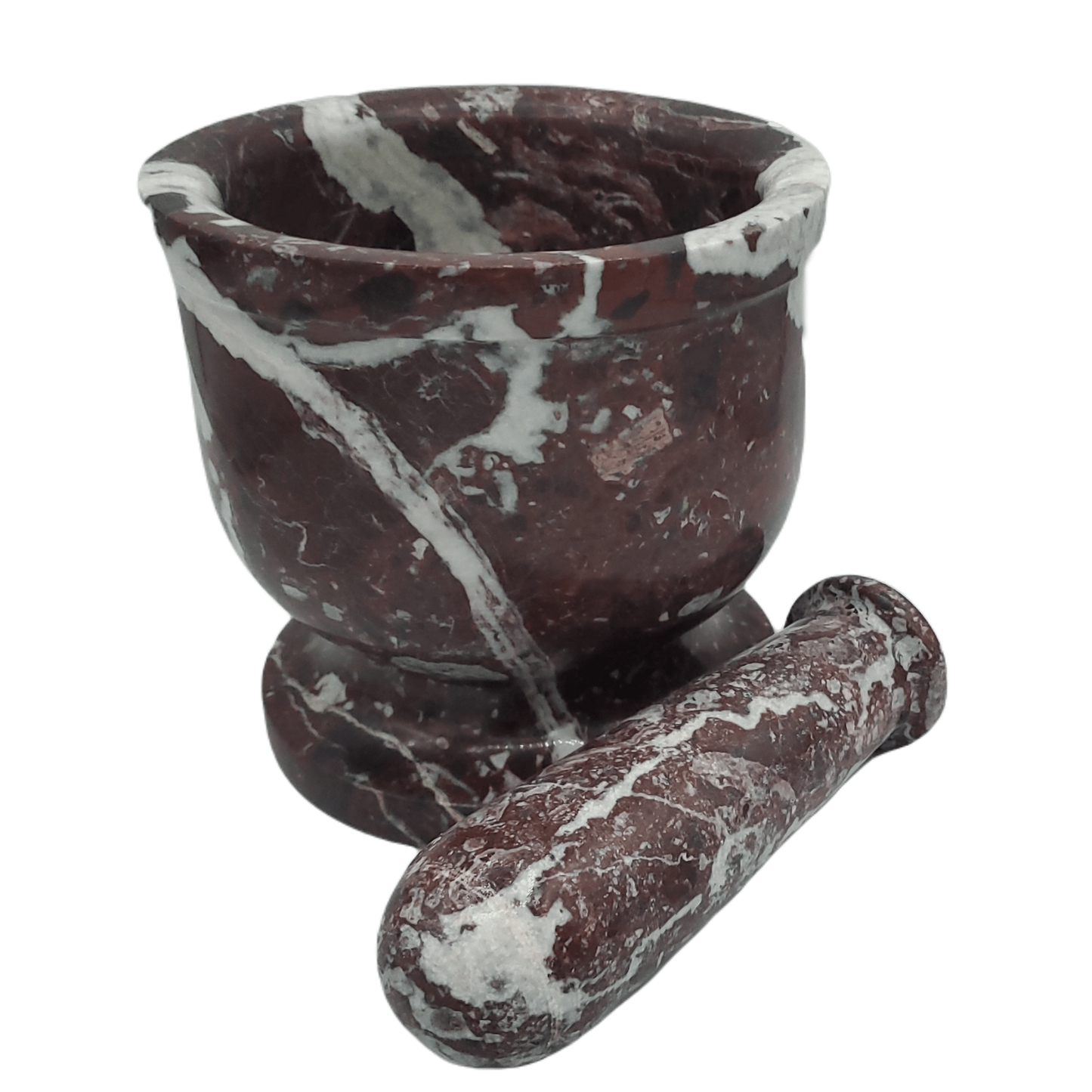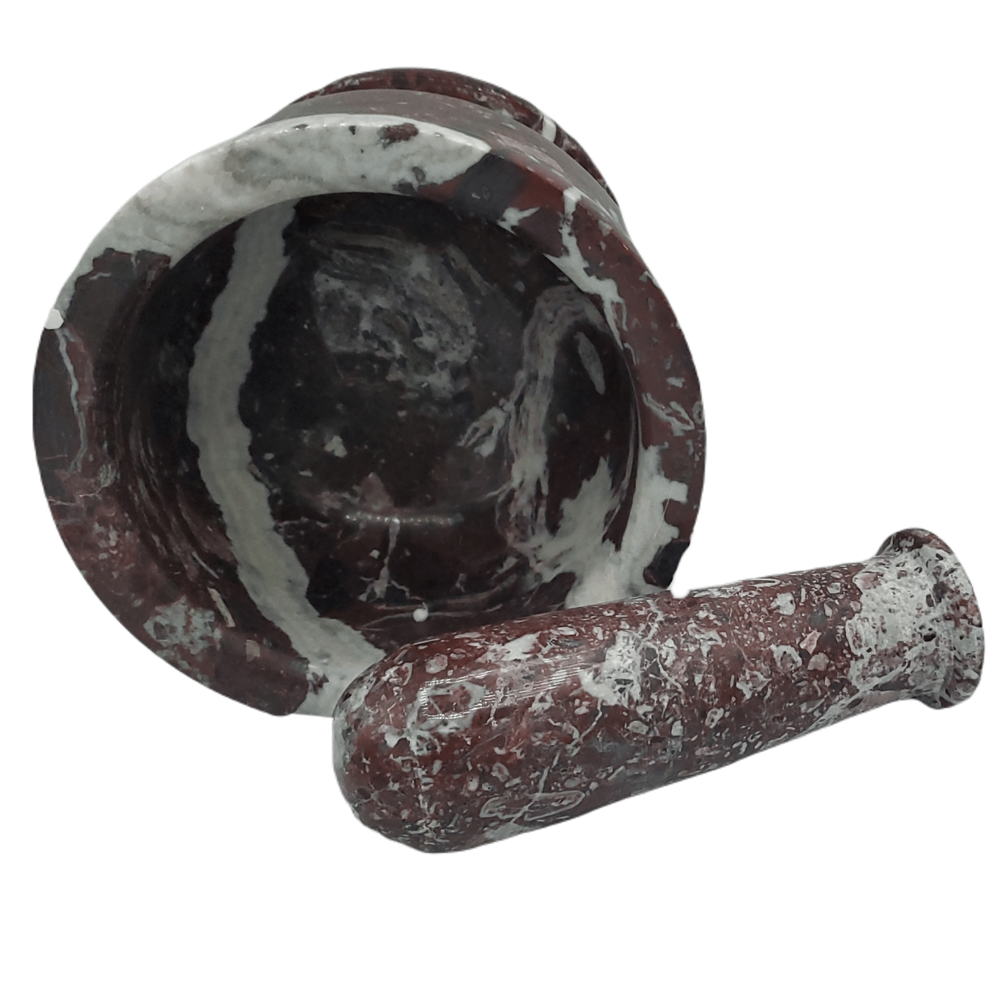 Handcrafted from High Quality Genuine Onyx Gemstone. This large and highly polished zebra onyx mortar and pestle is beautiful shades of brownish red, burgundy, white, gray and black. Use it for making guacamole, grinding tea, spices, and ingredients of all kinds.