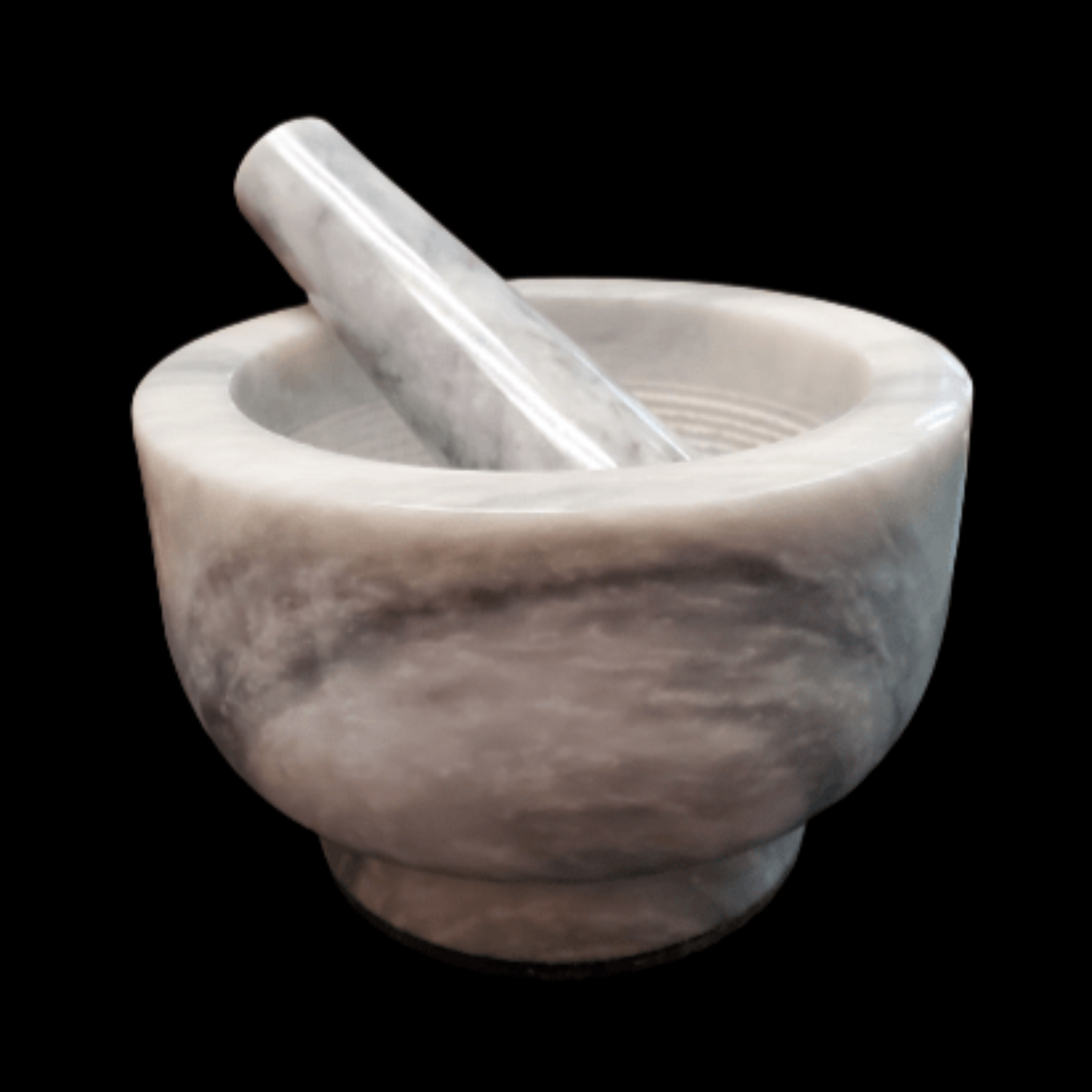 This beautiful mortar and pestle are carved, polished white onyx. The natural colors are white and gray. Mortar and pestle are implements used since ancient times to prepare ingredients or substances by crushing and grinding them into a fine paste or powder in the kitchen, laboratory, and pharmacy. Once you use a mortar and pestle, you will consider it a much-needed kitchen implement.
