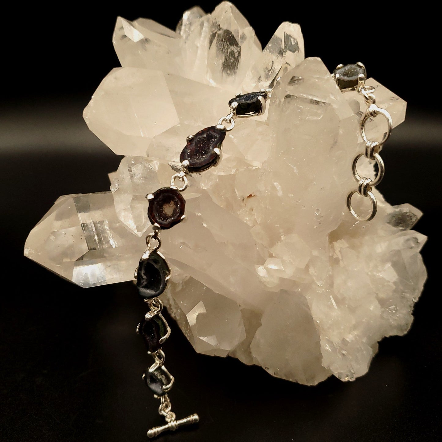 This bracelet features natural Agate Geodes in prong settings and is handcrafted in fine sterling silver. Eight-half geodes contain natural drusy inside, and the hues range from black to grey with some red.