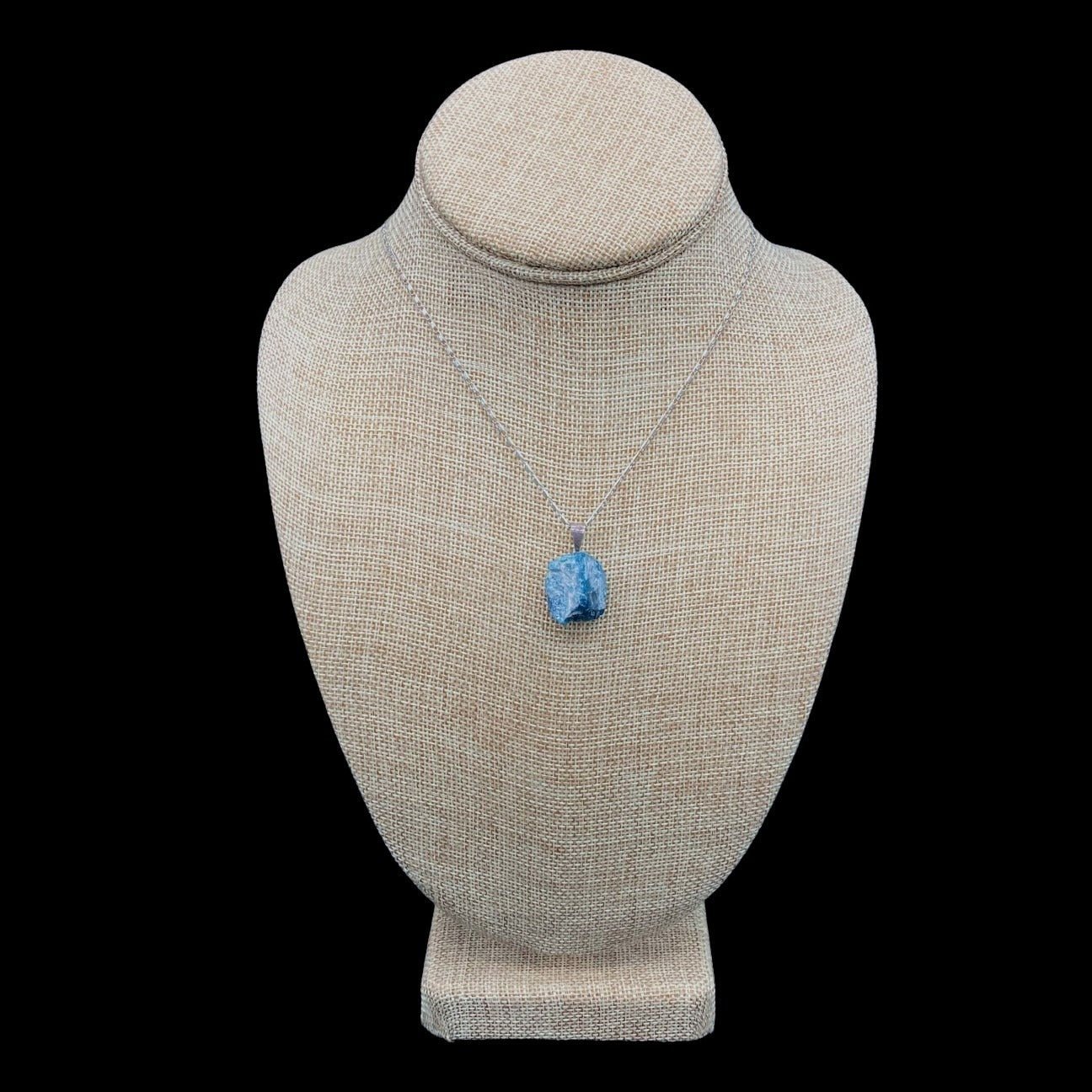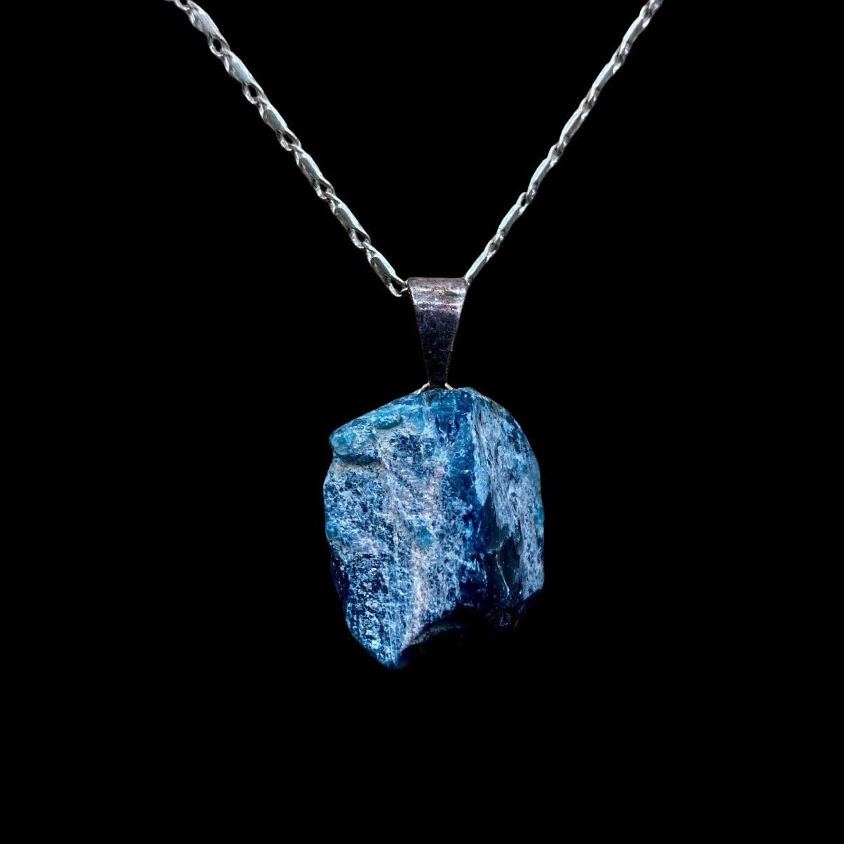 This sterling silver necklace features a blue apatite stone. Wearing this unique and one-of-a-kind necklace, you can carry the powerful energy of raw Apatite with you. Apatite is known as a stone of wisdom and personal power. It is a symbol of inner power.