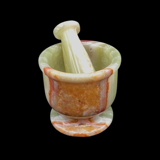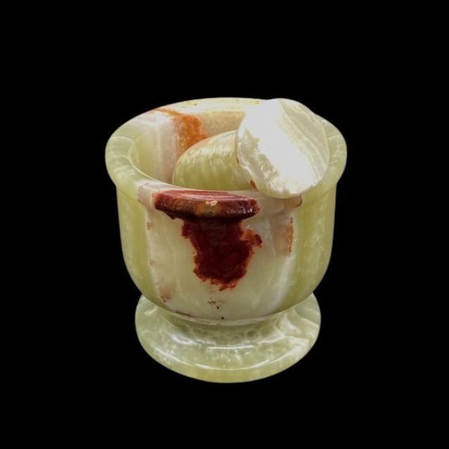 This is a beautifully hand-carved mortar and pestle. It is made out of banded Onyx. The color scheme is green, cream, dark brown, and orange. It has been polished all over and is smooth to the touch and glossy.