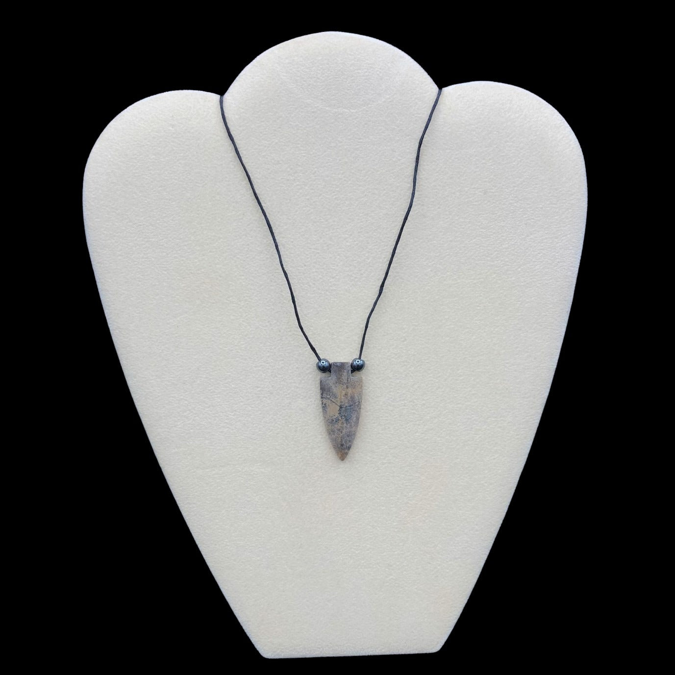 This Paint Brush Jasper arrowhead necklace would make a great gift. The arrowhead pendant itself is 1.75 inches long and is .75 of an inch wide. It has a smooth design and is gray and taupe in color.
