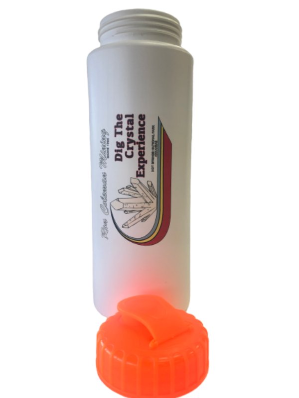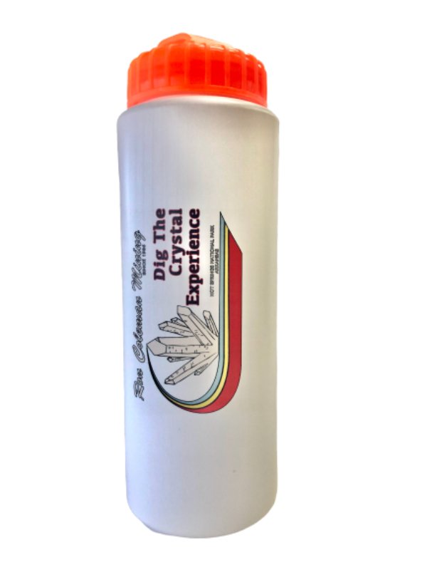 Take it along with you when you go hiking, walking or crystal digging!! Our white 32-ounce water bottle with “Dig The Crystal Experience” and a large crystal graphic is perfect for helping you keep up with your water intake and stay hydrated. This Ron Coleman Mining souvenir is BPA free. BPA is an endocrine disrupter. The bright orange top will make it easy to find when you lay it down in a group of other water bottles. Fill it up with water and ice and bring it along on your next crystal digging trip.