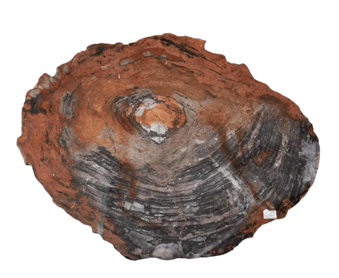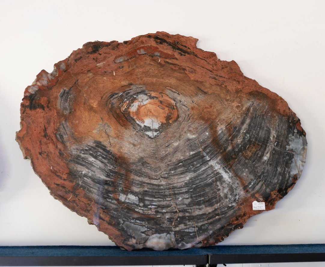 Large, petrified wood slab with polished top and bottom. The sides of the specimen are rough. This mineral specimen is versatile enough to use as a rustic decor accent or in a home or office with minimalist decor ideas. Visualize this slab as a side table with a black iron metal base. Though we do not make the table base, any metal arts business can create one. At over 3 feet wide, it can definitely be a focal piece in any space. The natural tones are brown, black, cream, gray, and mustard.