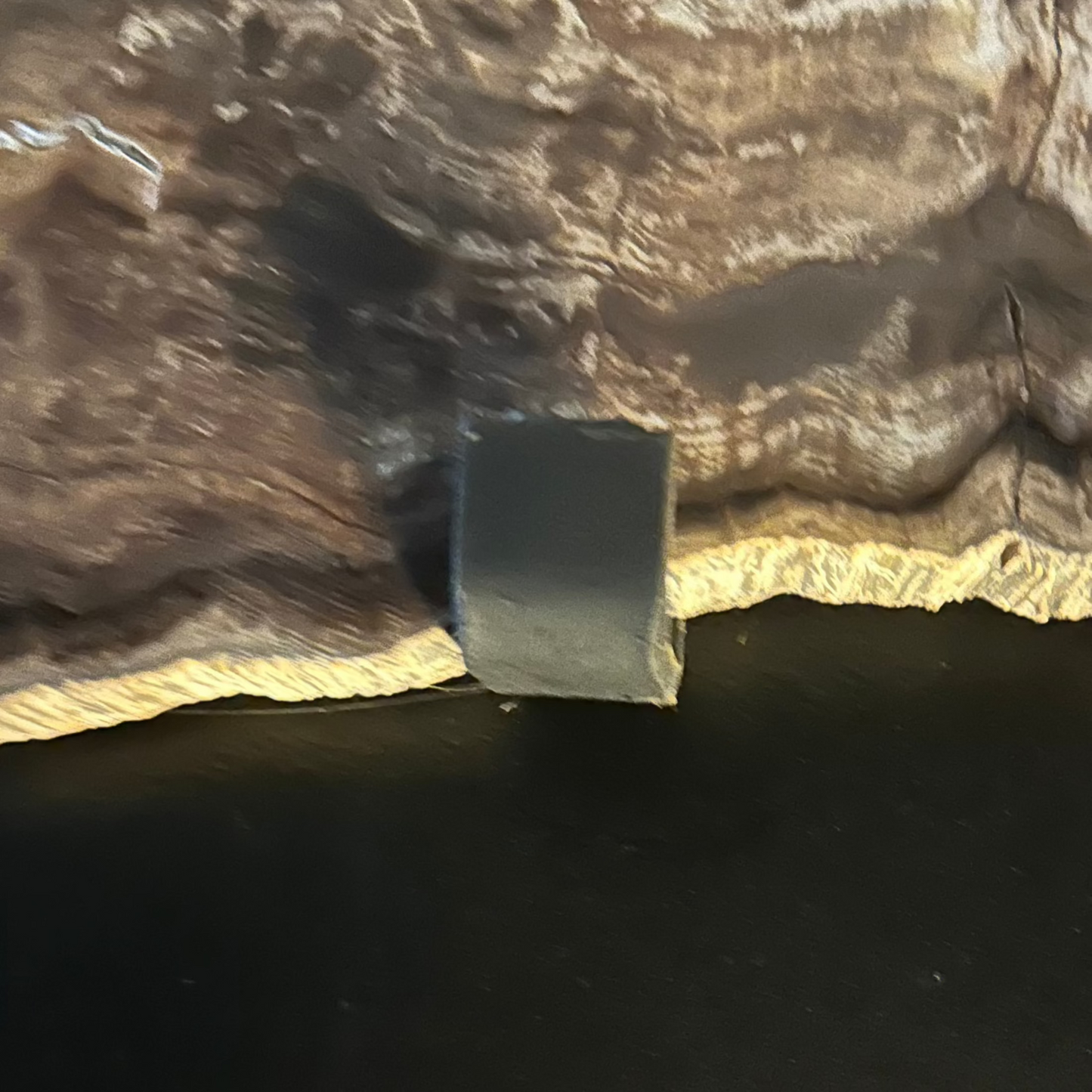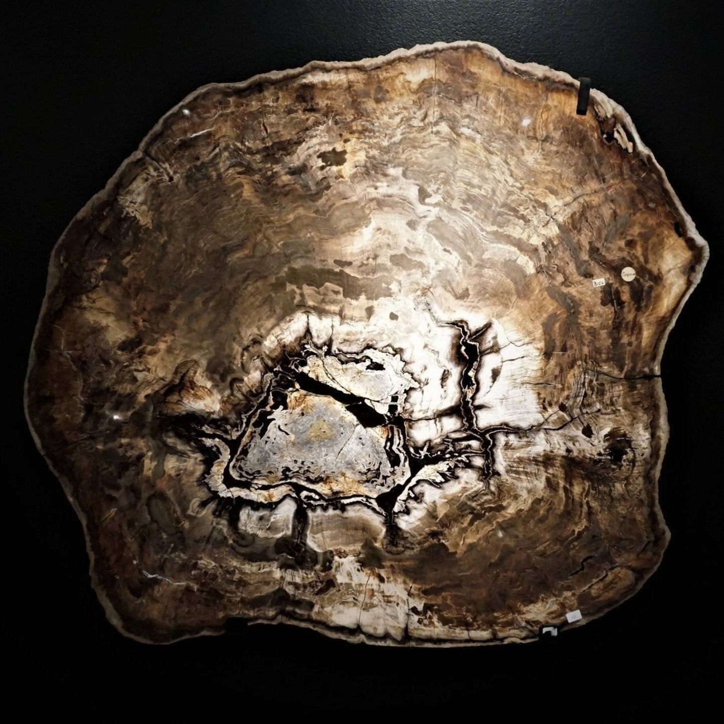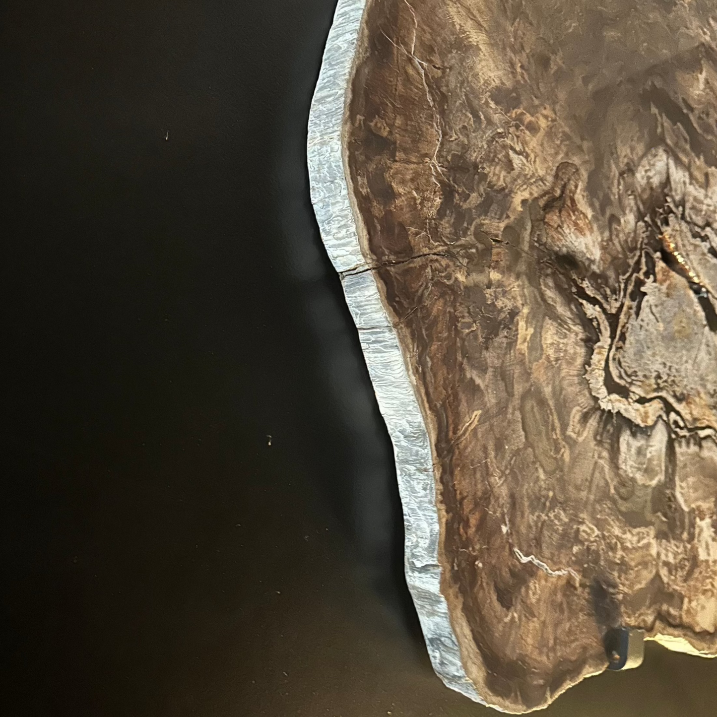 Beautiful genuine petrified wood slab with natural brown, cream, and black color tones. Perfect for rustic home or cabin decor. Though your purchase includes the black metal frame used for hanging on the wall, you can also go DIY and make this into a unique side table with glass top. Any metal artist can create a table bottom for the slab. Petrified wood is referred to as the stone of perseverance in Feng Shui.