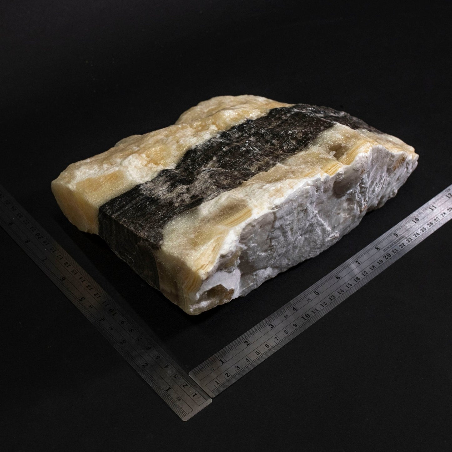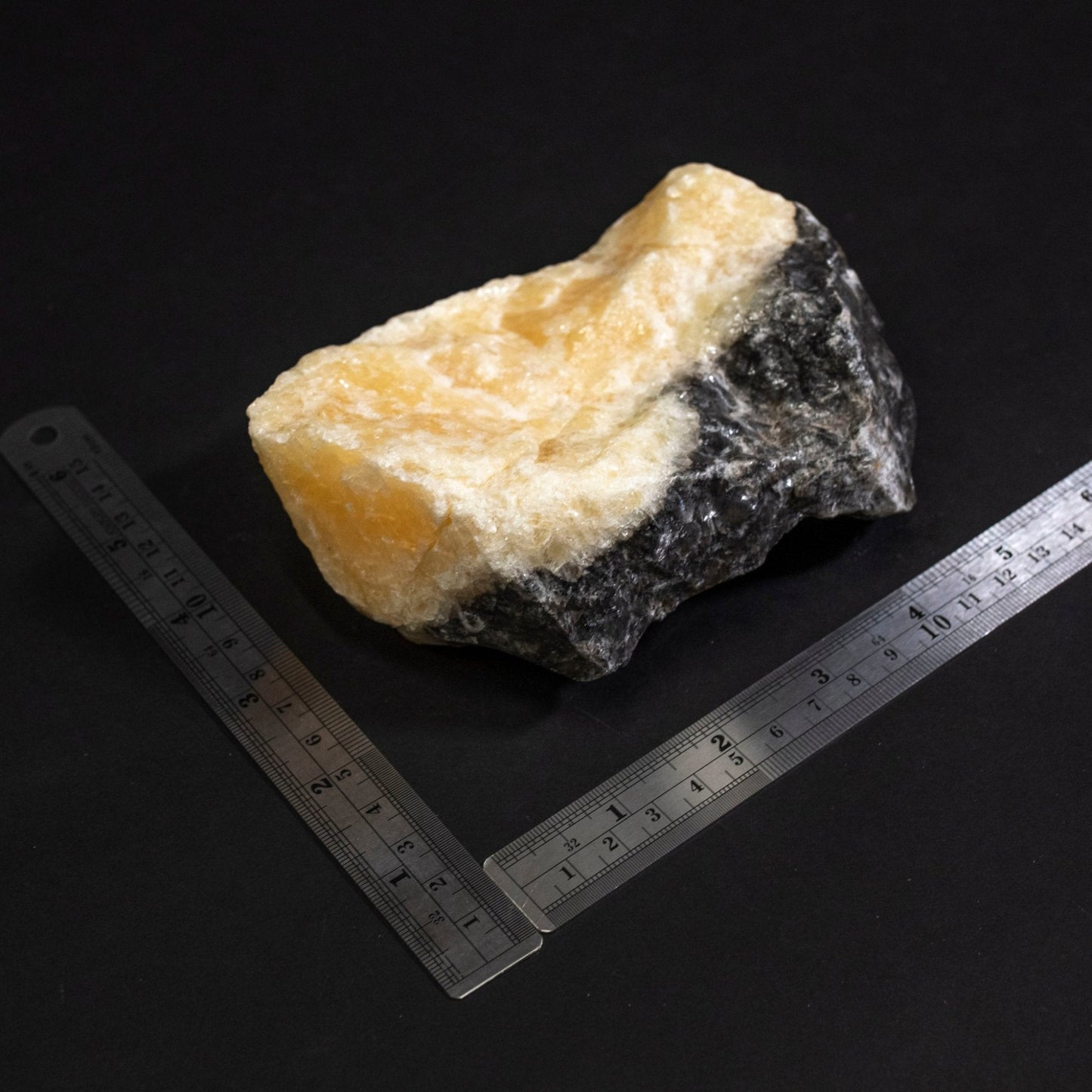 3. Phantom calcite is a calcium carbonate mineral with the chemical composition of CaC03. It is a combination of black, white, and orange calcite minerals that form when sand and other minerals fill spaces in the calcium carbonate.