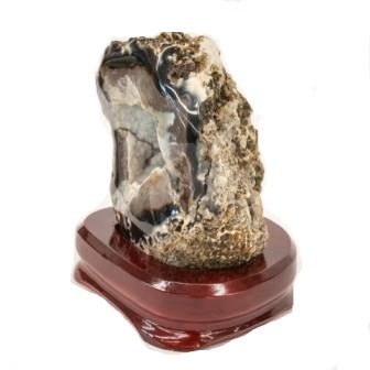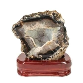 This beautiful Agate specimen has sparkling white Drusy and is a unique decor accessory. The polished edge has natural black, brown, cream, and white colors. The wood base is a cherry tone that was cut specifically for this specimen. If cherry wood is not the color you seek, simply use light sanding paper and repaint the wood base to your preferred color.